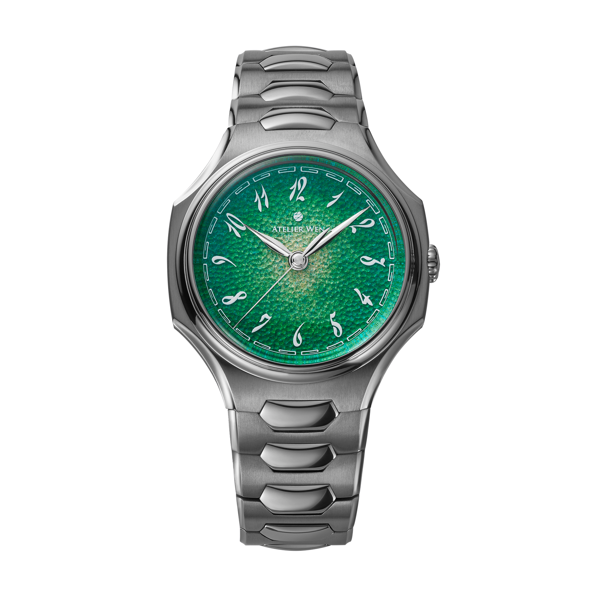The Atelier Wen Inflection 幽 Yōu watch features an automatic movement housed within a 40mm tantalum case. Its green dial is crafted from a hand-hammered 925 silver base by the Beijing workshop of Kong Lingjun, delivering layered texture and tonal depth. Western-Arabic numeral hour markers, designed by Lee Yuen-Rapati and inspired by Chinese bamboo leaf calligraphy, create a distinctive and balanced dial layout. Protection comes from a double-domed sapphire box crystal with five layers of anti-reflective coating. The 99.9% pure tantalum bracelet showcases curved external and middle links, with vertically brushed outer links, mirror-polished center links, and concave polished chamfers. Tapering from 22mm at the case to 18mm at the clasp, it is secured by a telescopic deployant blade with a patent-pending, four-position on-the-fly micro-adjustment system and a quick-release mechanism. An additional green sailcloth strap is included. The watch is water resistant to 100 meters.