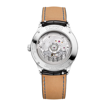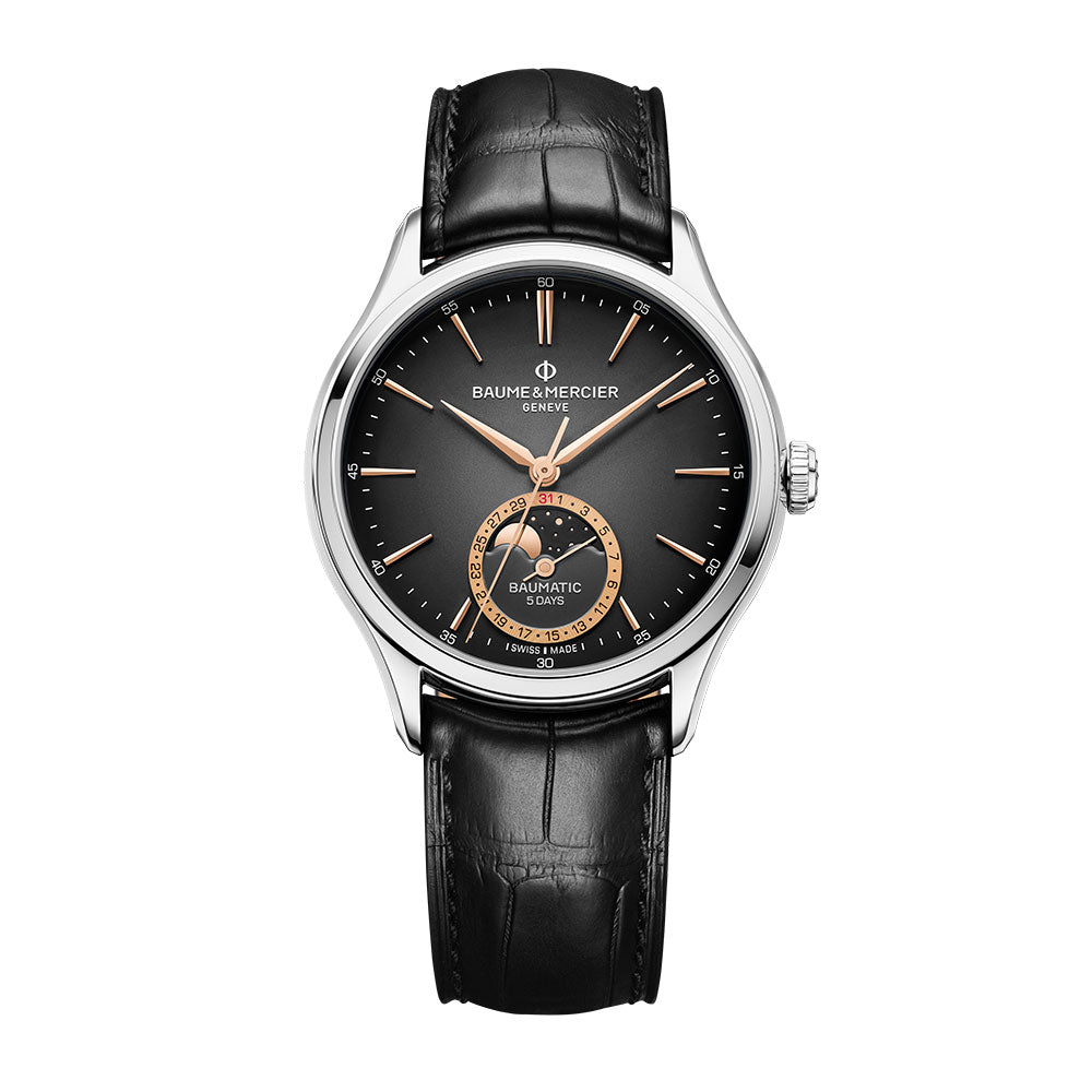The Baume & Mercier Clifton 10758 watch is powered by an automatic movement housed within a 39mm stainless steel case. The dark gradient gray dial features a moon phase function and a date wheel. It is covered by sapphire crystal. The black leather strap has a deployant clasp. Water resistant to 50 meters.