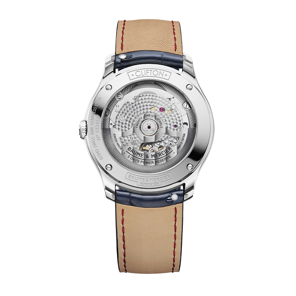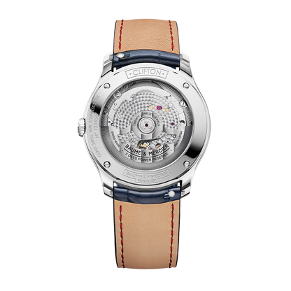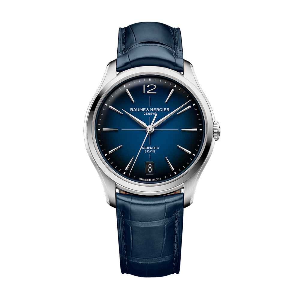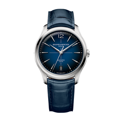 The Baume & Mercier Clifton 10771 watch runs on an automatic movement contained within a 39mm stainless steel case. The blue dial reveals a date window and is covered by sapphire crystal. The blue leather strap is secured by a folding clasp. Water resistant to 50 meters.