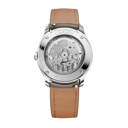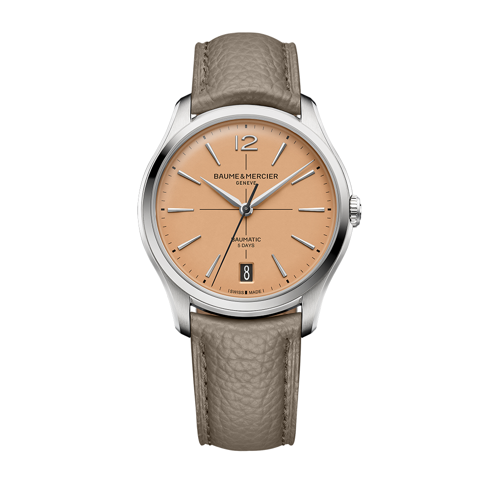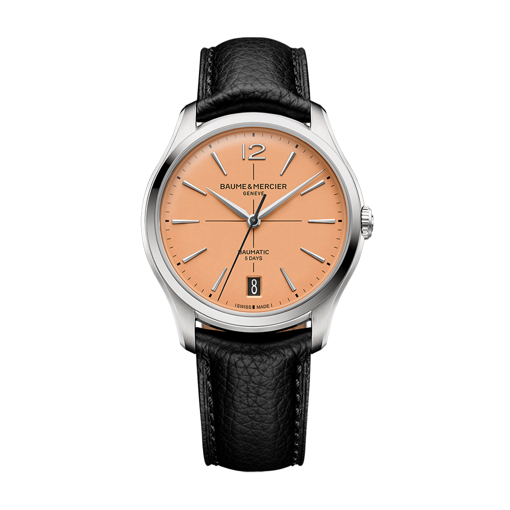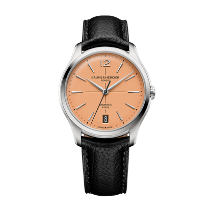 The Baume & Mercier Clifton 10778 limited edition watch is powered by an automatic movement inside of a 39mm stainless steel case. The salmon dial showcases a date window at 6 o'clock. The black leather strap leads to a folding buckle. An additional interchangeable beige leather strap is included. Water resistant to 50 meters. Limited edition of 350 pieces.