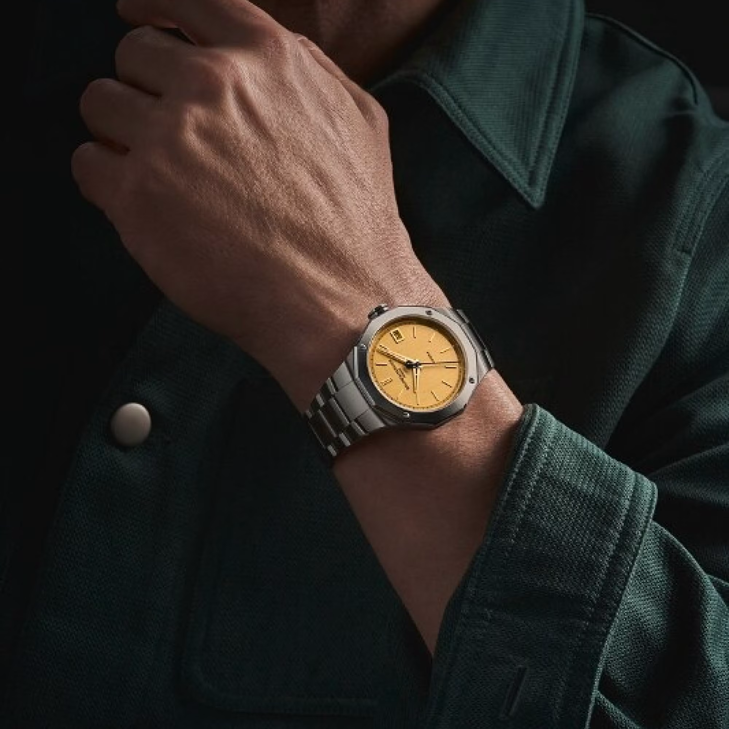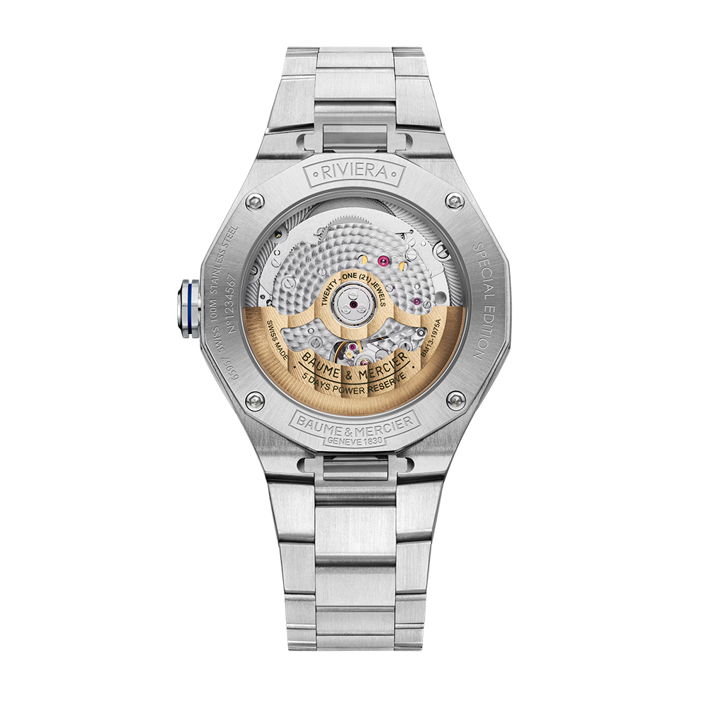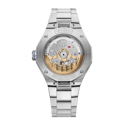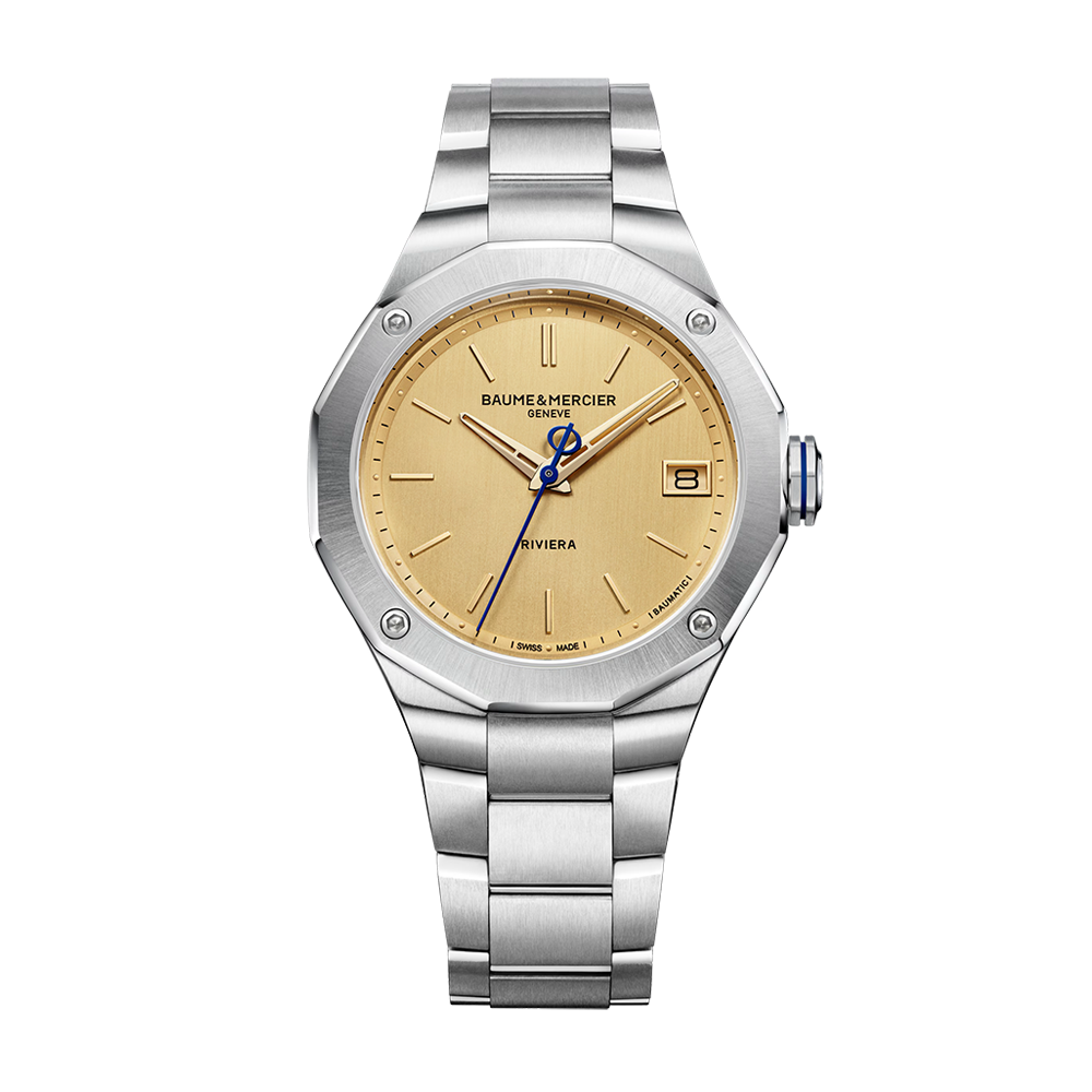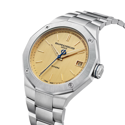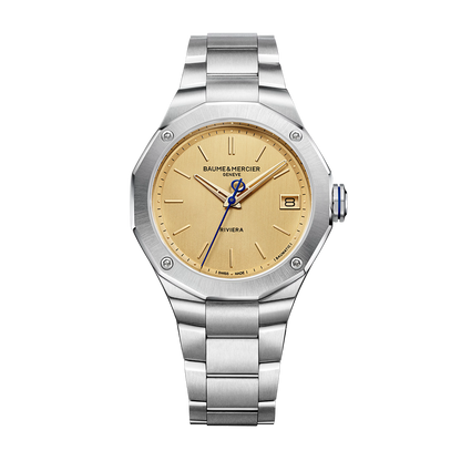 The Baume & Mercier Riviera 10822 watch has an automatic movement housed within a 39mm stainless steel case. The gilded dial includes a date window and is covered with sapphire crystal. The stainless steel bracelet is secured by a folding clasp. Water resistant to 100 meters.