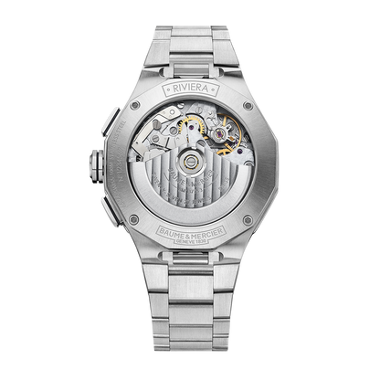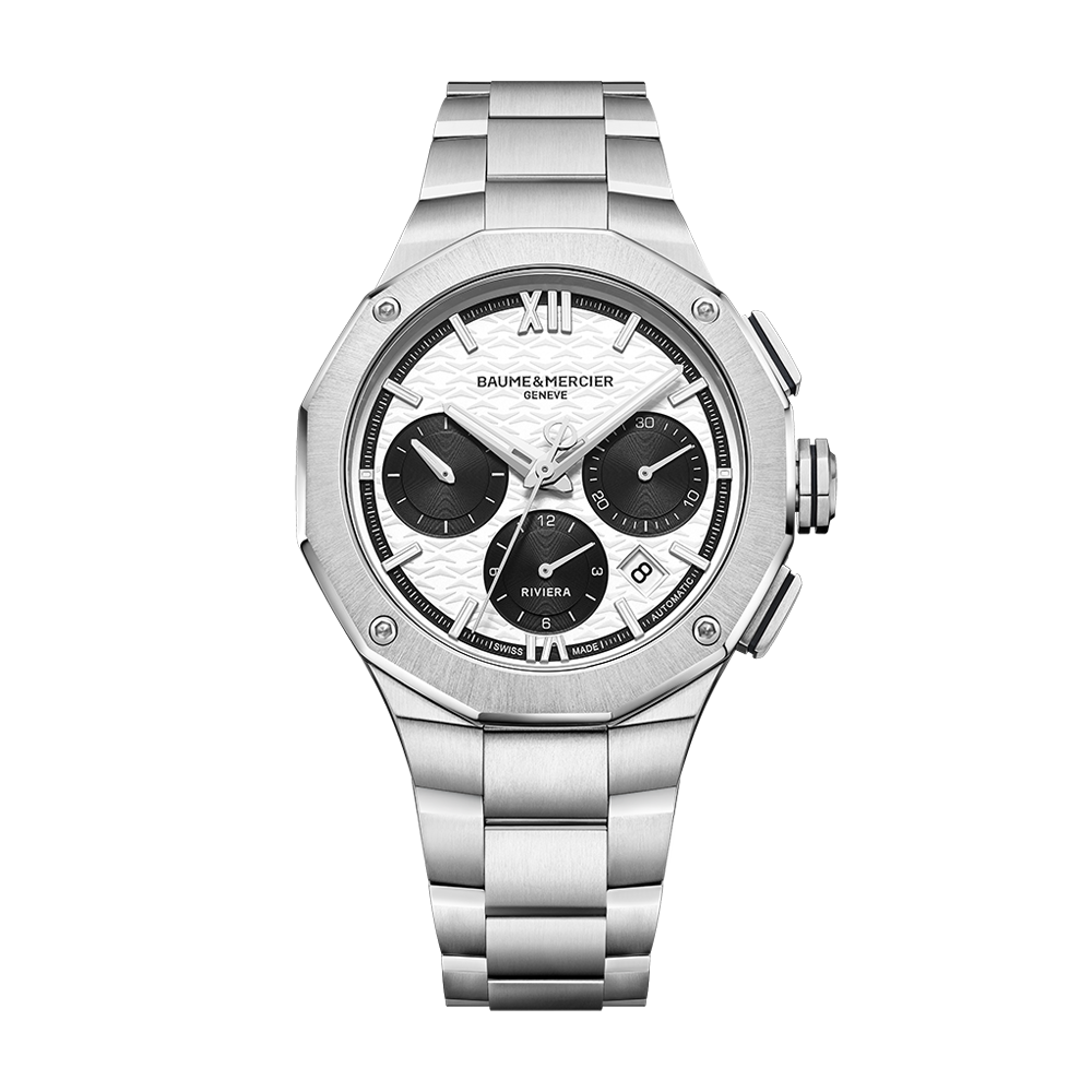 The Baume & Mercier Riviera 10827 watch has an automatic movement contained within a 41mm stainless steel case. The white dial is contrasted by a chronograph function with black dials. It includes a date window and is protected by sapphire crystal. The stainless steel bracelet has a folding clasp. Water resistant to 100 meters.