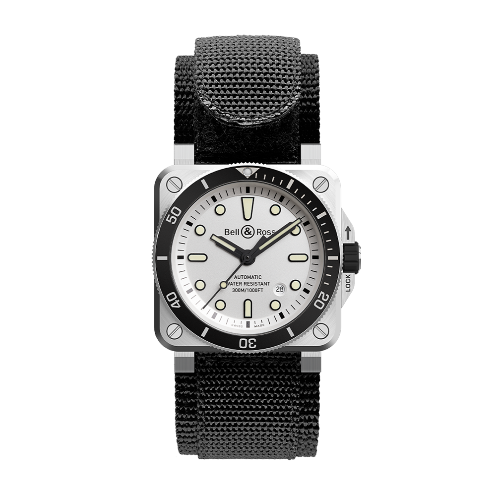 The Bell & Ross BR 03-92 Diver White watch has an automatic movement housed within a 42mm stainless steel case with a black unidirectional rotating bezel. The silver opaline dial includes a date window and is covered with anti-reflective sapphire crystal. This watch includes both a black rubber and black synthetic fabric strap. This divers watch is water resistant to 300 meters.