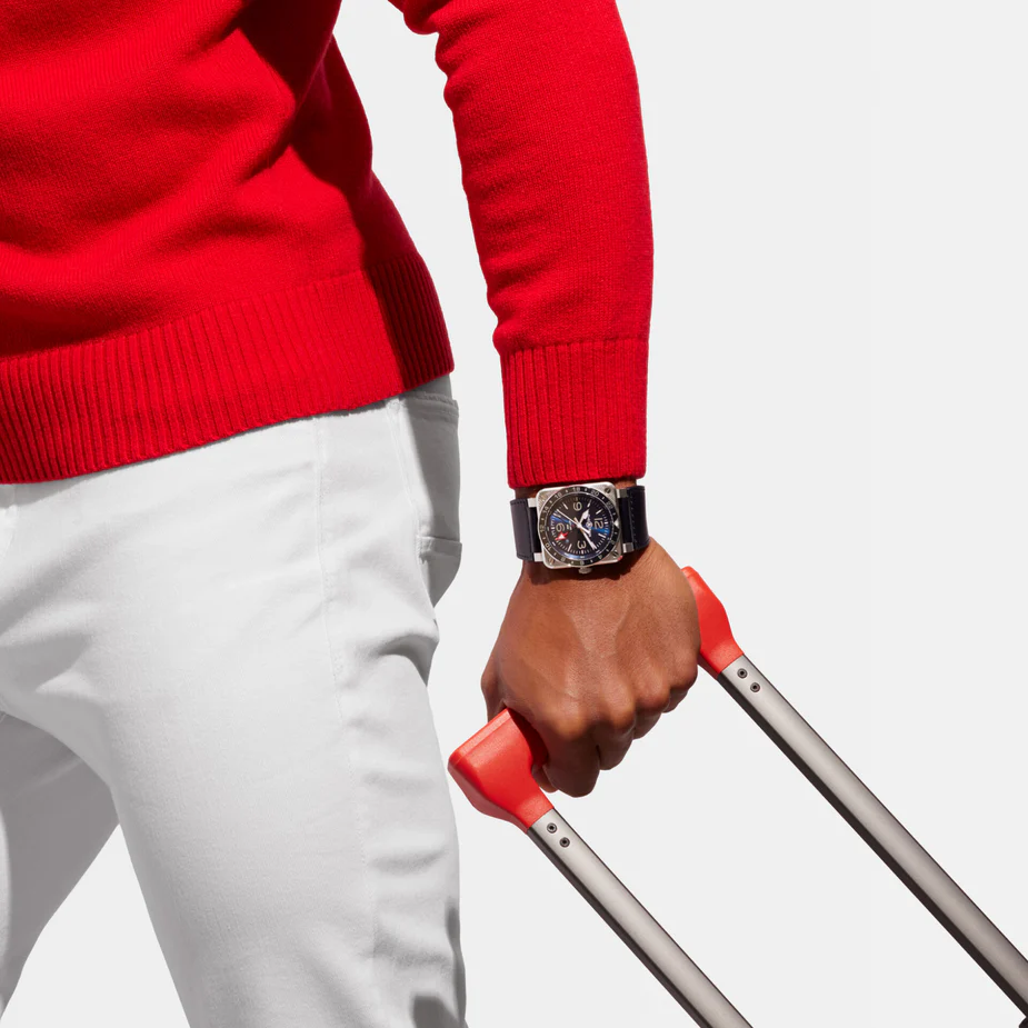 The BR 03-93 GMT Blue features a blue and grey bezel indicating day and night hours, with a matching blue sunburst dial. The 42mm steel case is powered by the automatic BR-CAL.303 with 42-hour power reserve. Blue Nappa calfskin leather strap, 100m water resistance.