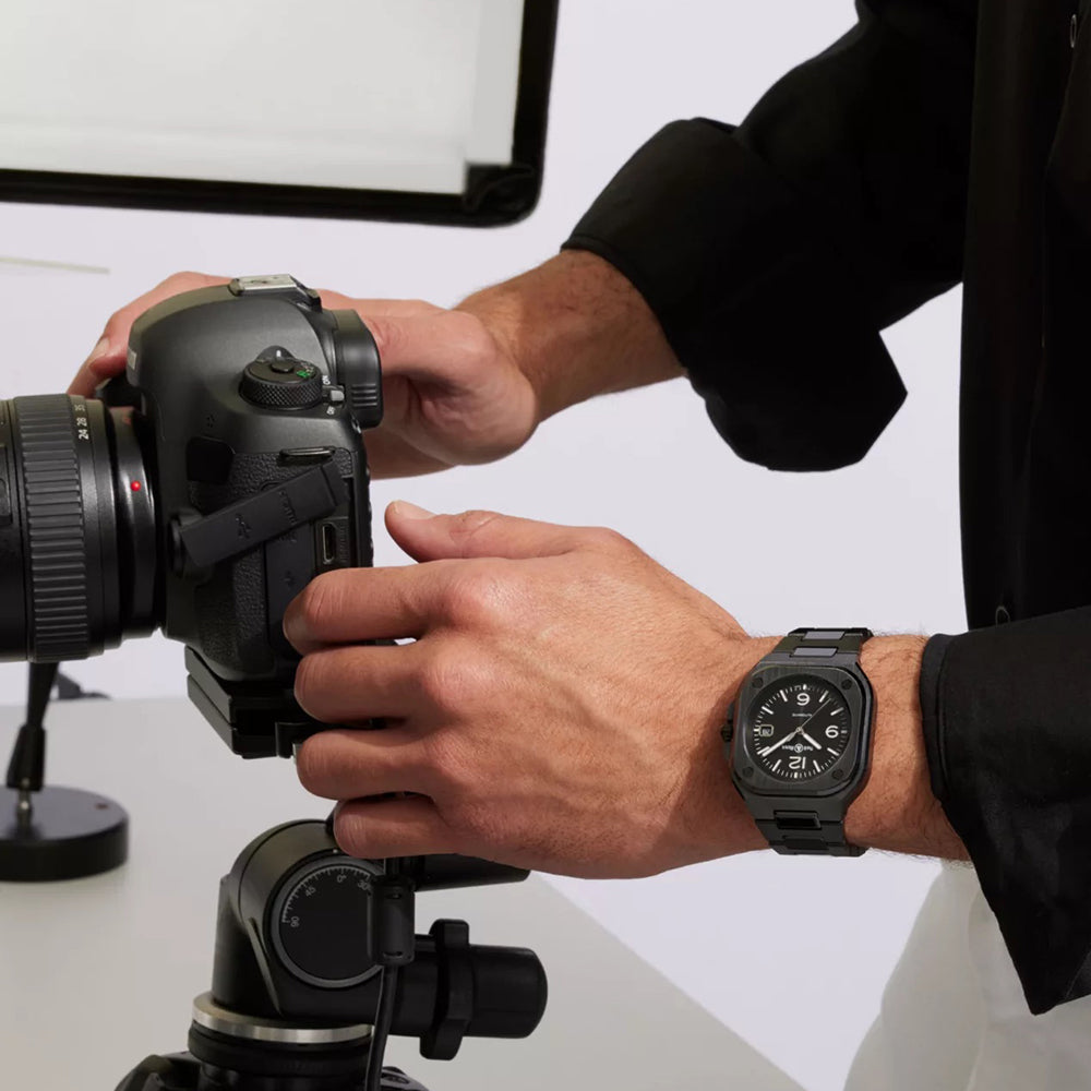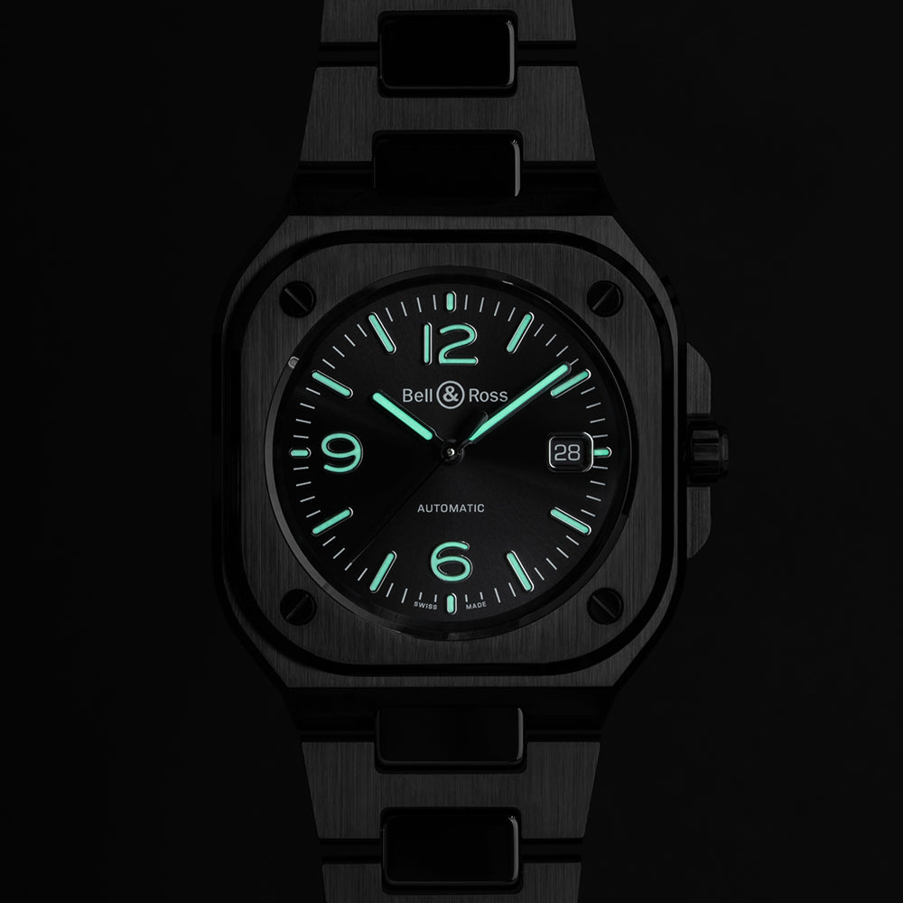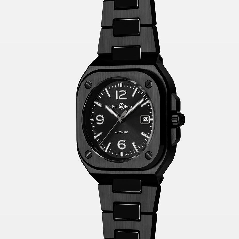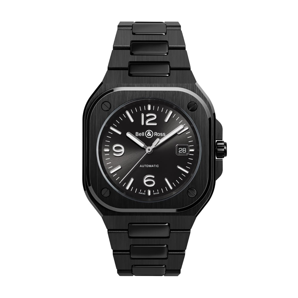 The Bell & Ross BR 05 Black Ceramic watch runs on an automatic movement inside of a 41mm black ceramic case. The black dial features a date window and is covered by sapphire crystal. The black ceramic bracelet includes a black PVD-coated steel deployant clasp. Water resistant to 100 meters.