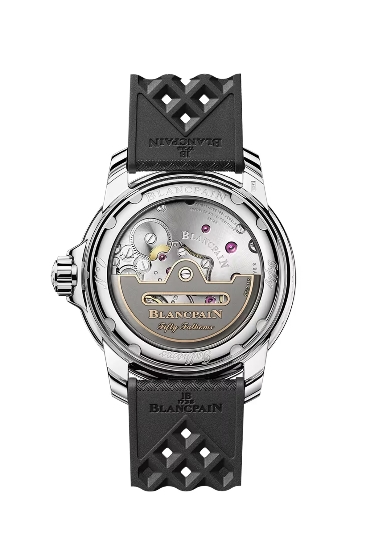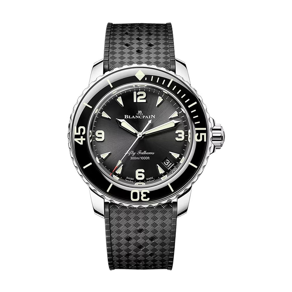 The Blancpain Fifty Fathoms Automatique is one of the world's most iconic dive watches, launched in 1953 by Blancpain for combat swimmers. The 42mm stainless steel case features an asymmetrical crown protector, satin-finished unidirectional rotating bezel, and black dial. Powered by calibre 1315 automatic with 120-hour power reserve. Black rubber strap, 300m water resistance.