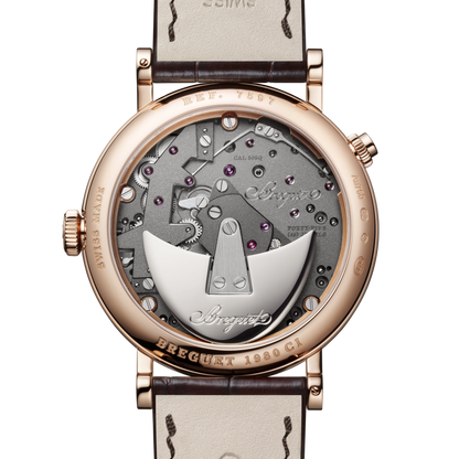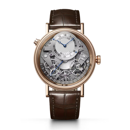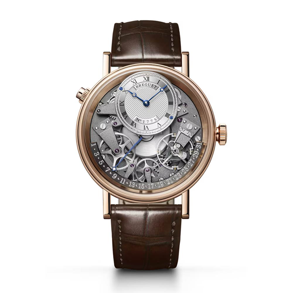 The Breguet Tradition Quantième Rétrograde 7597 watch runs on an automatic movement inside of a 40mm rose gold case. The silver openwork dial includes a date function and is protected by sapphire crystal. The brown leather strap leads to a rose gold tang buckle. Water resistant to 30 meters.