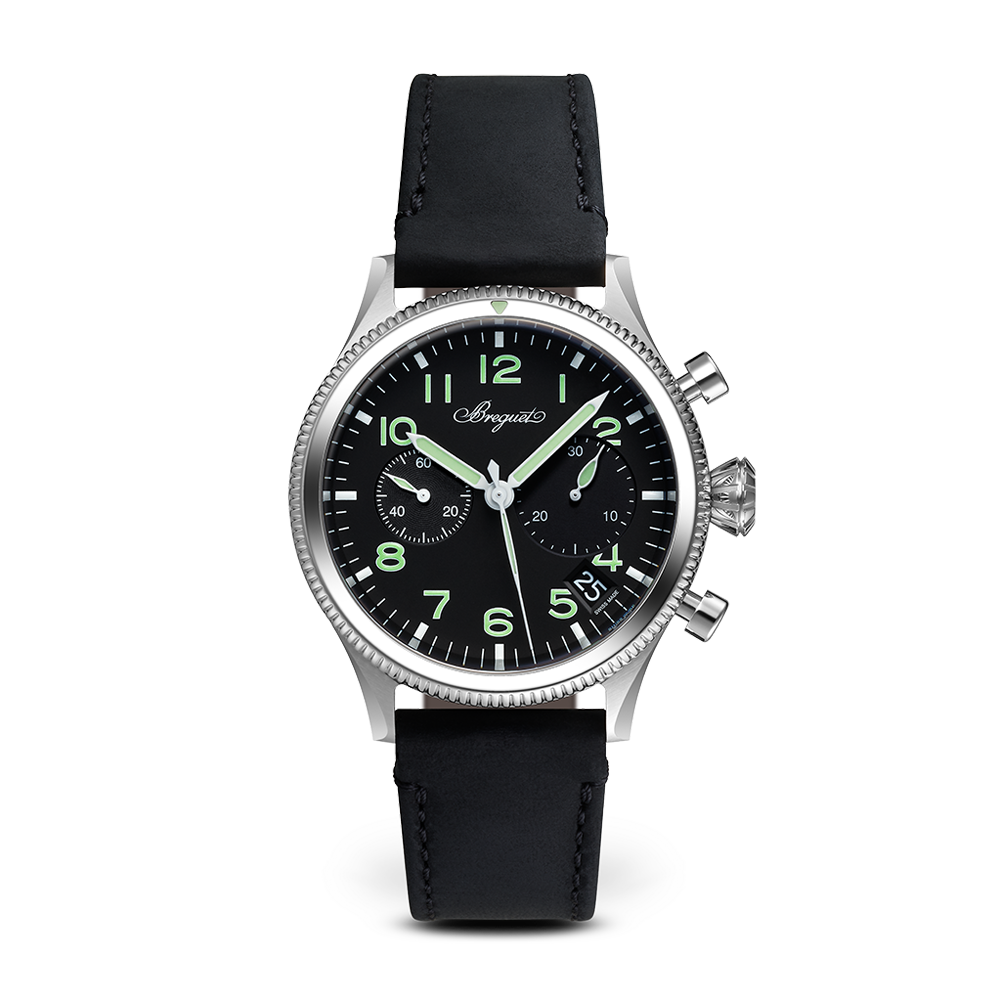 The Breguet Type 20 Chronographe 2057 watch includes an automatic movement inside of a 42mm stainless steel case. The black dial showcases chronograph function and a date window. It is protected by sapphire crystal. The hands, indices, and hour-markers are luminescent. The black fabric strap leads to a tang buckle. Water resistant to 100 meters.