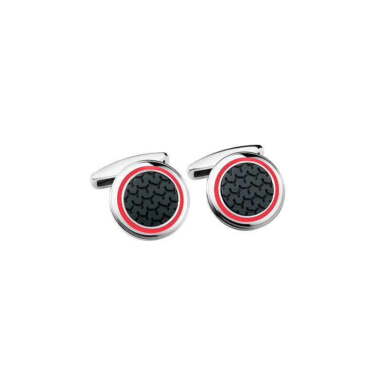 These Chopard Mille Miglia cufflinks are comprised of stainless steel with black rubber inlays outlined with red rings.