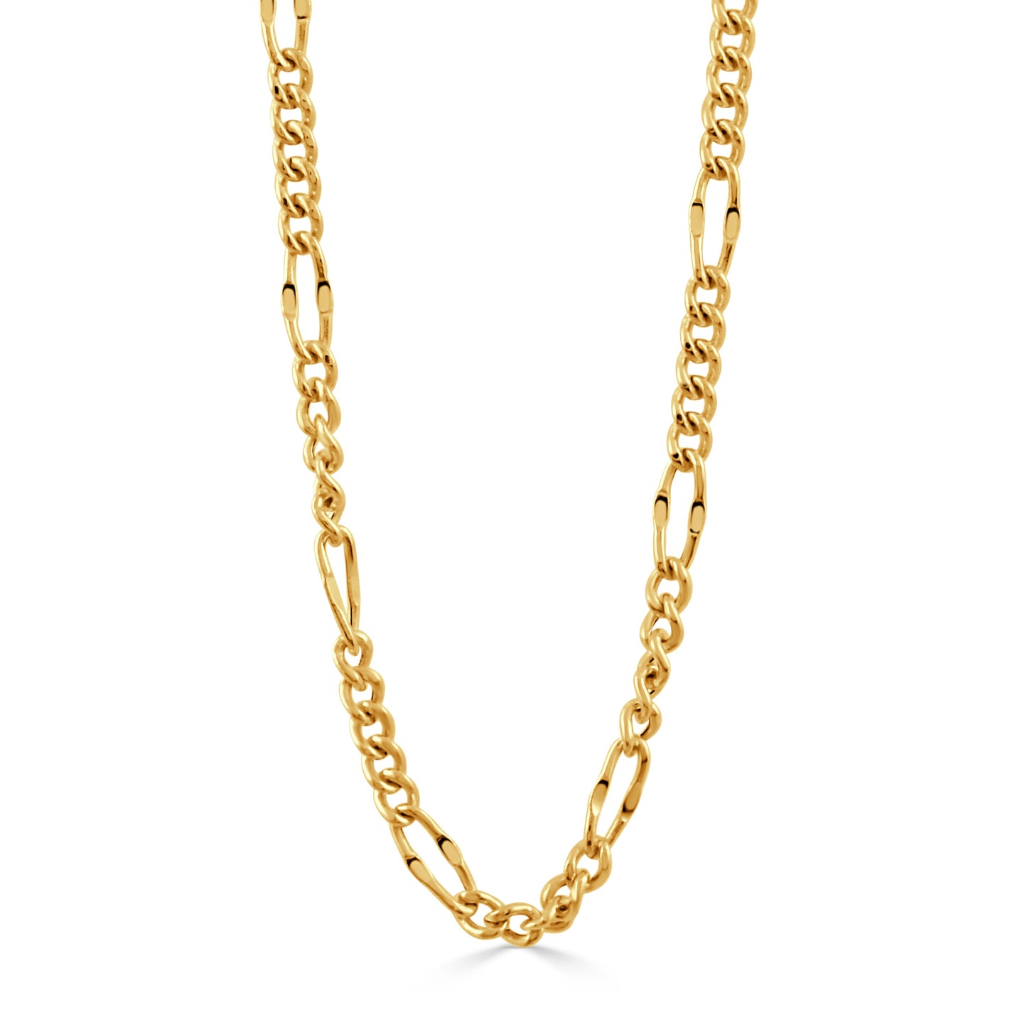 This Doves Figaro chain necklace is made of 18K yellow gold. The chain measures approximately 18 inches long with links that are approximately 3mm wide. Photo is enlarged to show detail.