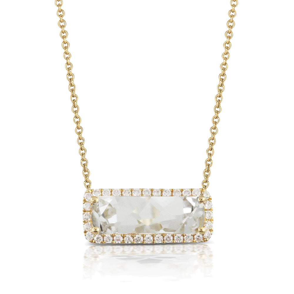 This Doves Lucente pendant necklace is made of 18K yellow gold. The necklace showcases a 1.68 carat faceted white topaz center accented by a 0.11 carat diamond halo.
