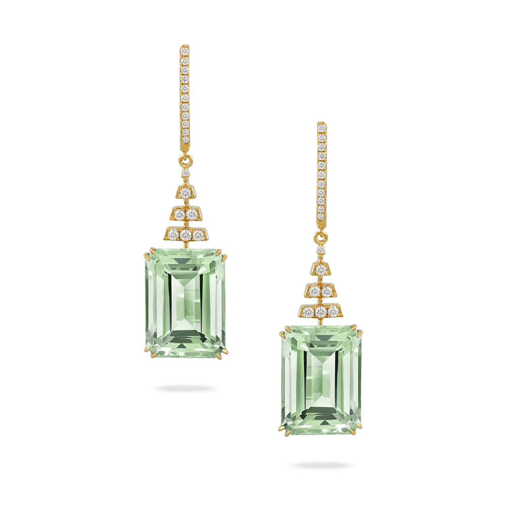 These Doves Mint Mojito dangle earrings are crafted in 18K yellow gold. The drop earrings feature 15.62 carats of rectangular green amethyst accented by 0.28 carats of diamonds.