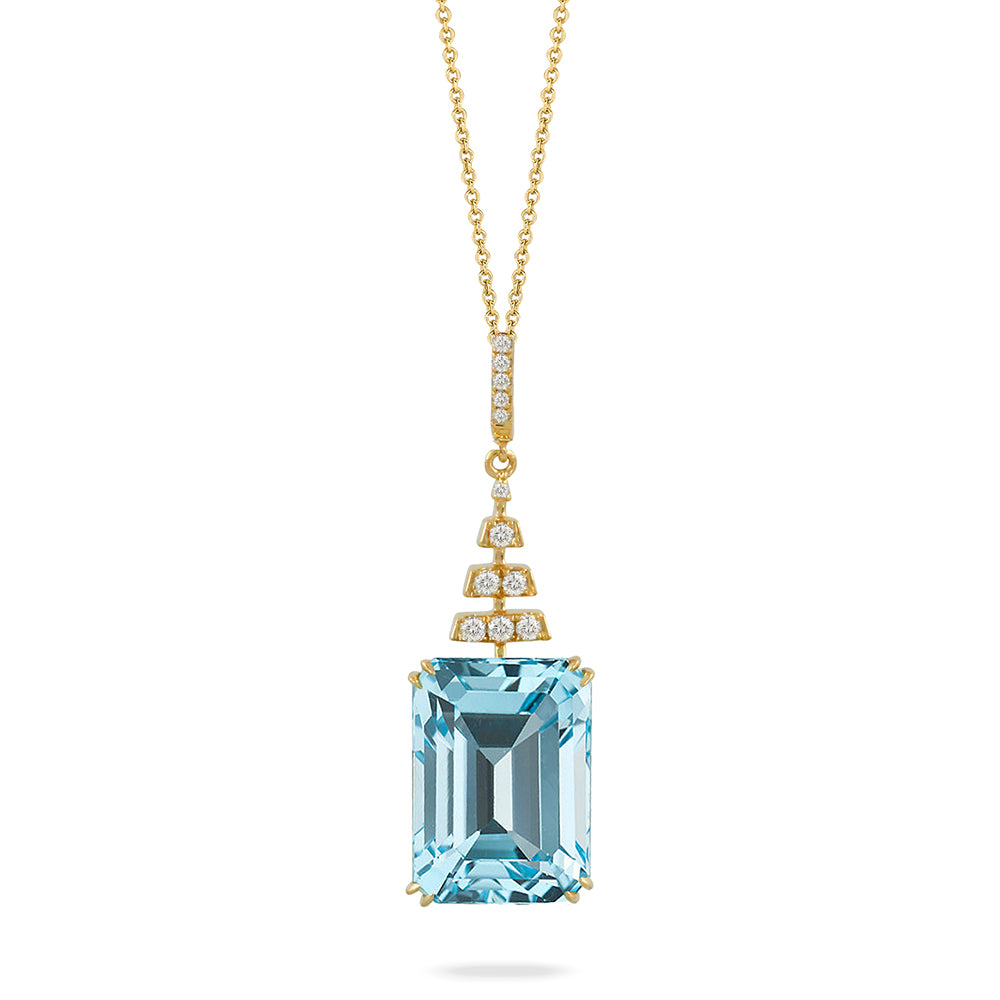 This Doves Sky Blue topaz pendant is made of 18K yellow gold. The pendant is set with a 8.78 carat sky blue topaz gemstone accented by 0.14 carats of diamonds. This pendant measures approximately 32 X 10mm. This listing is for the pendant only. Chain sold separately.