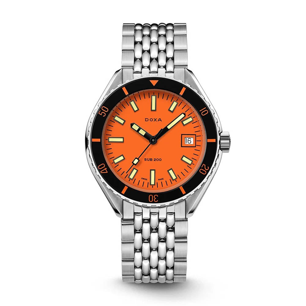 The DOXA SUB 200 Professional watch is powered by an automatic movement inside of a 42 x 46mm stainless steel case with a black rotating bezel. The orange dial reveals a date window and is covered by sapphire crystal. The stainless steel bracelet leads to a folding clasp with wetsuit extension. Water resistant to 200 meters.