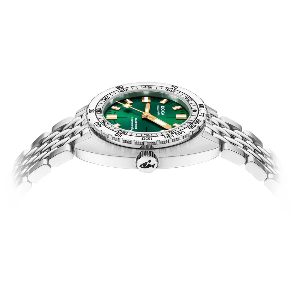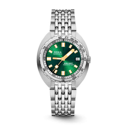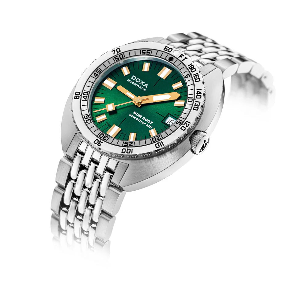 The DOXA SUB 200T Sea Emerald watch features an automatic movement in a 39mm × 41.50mm stainless steel case with a rotating bezel. The green dial has a date display and is protected by sapphire crystal. The stainless steel bracelet includes a deployant clasp. Water resistant to 200 meters.