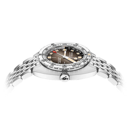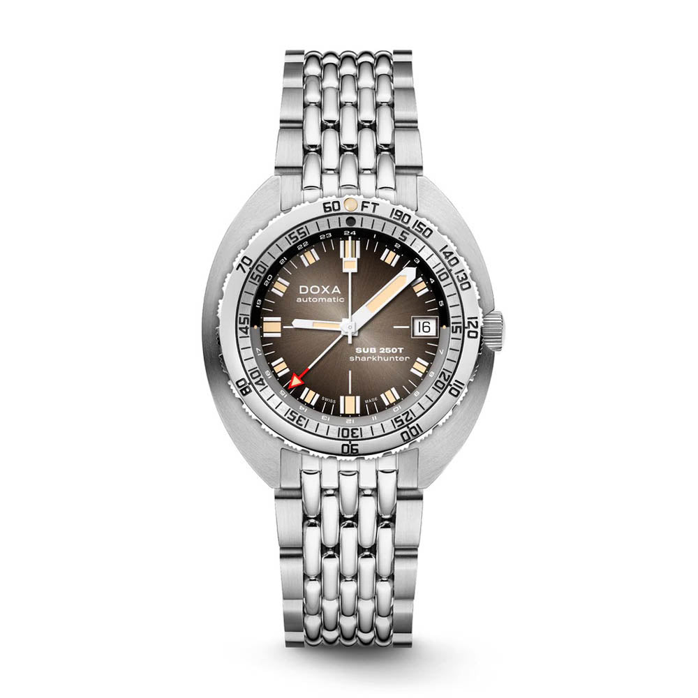 The DOXA SUB 250T GMT Sharkhunter Vintage watch features an automatic movement in a 40mm × 42.90mm stainless steel case with a rotating bezel. The gray dial includes a date display and is protected by sapphire crystal. The stainless steel bracelet includes a deployant clasp. Water resistant to 250 meters.