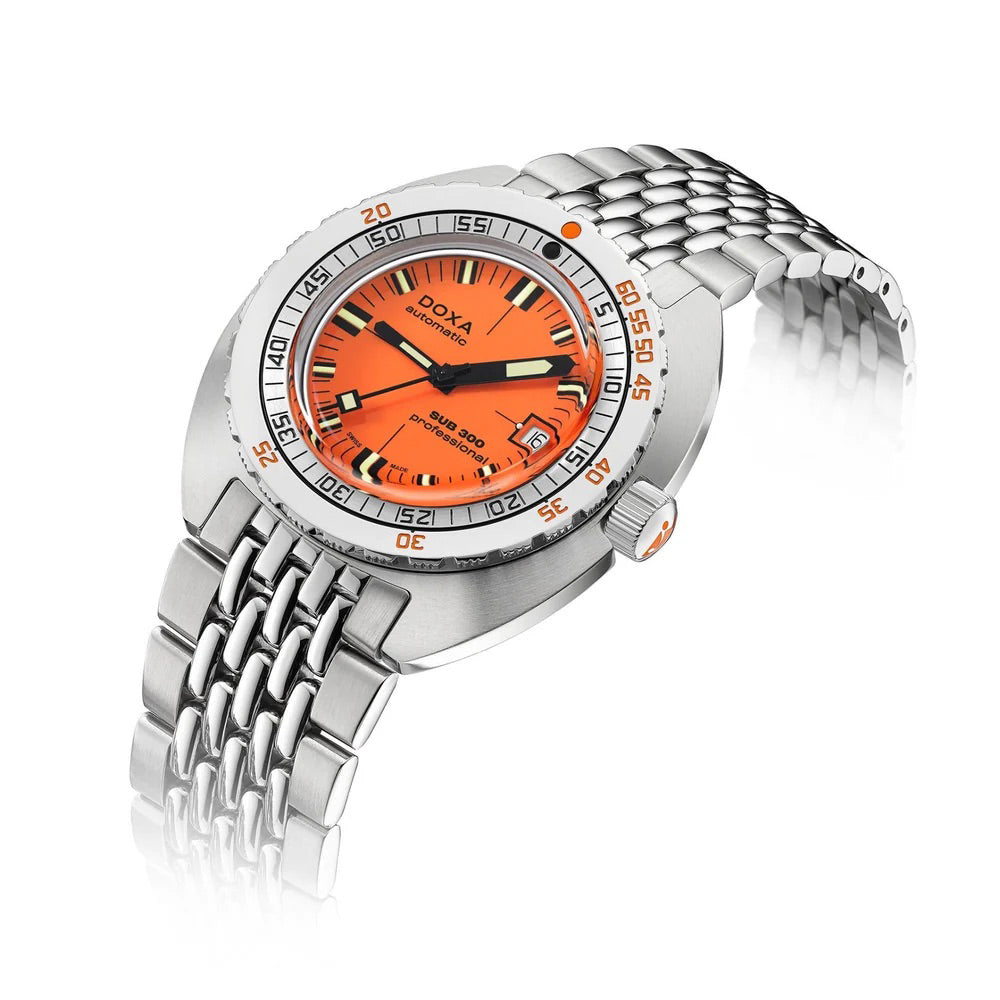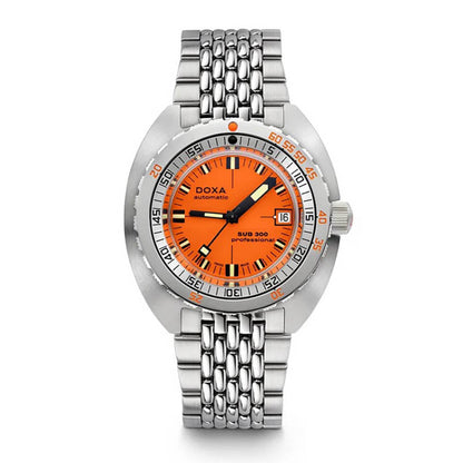 The DOXA SUB 300 Professional watch has an automatic movement in a 42.50mm × 45.00mm stainless steel case with a rotating bezel. The orange dial has a date display and is covered by sapphire crystal. The stainless steel bracelet includes a deployant clasp. Water resistant to 300 meters.