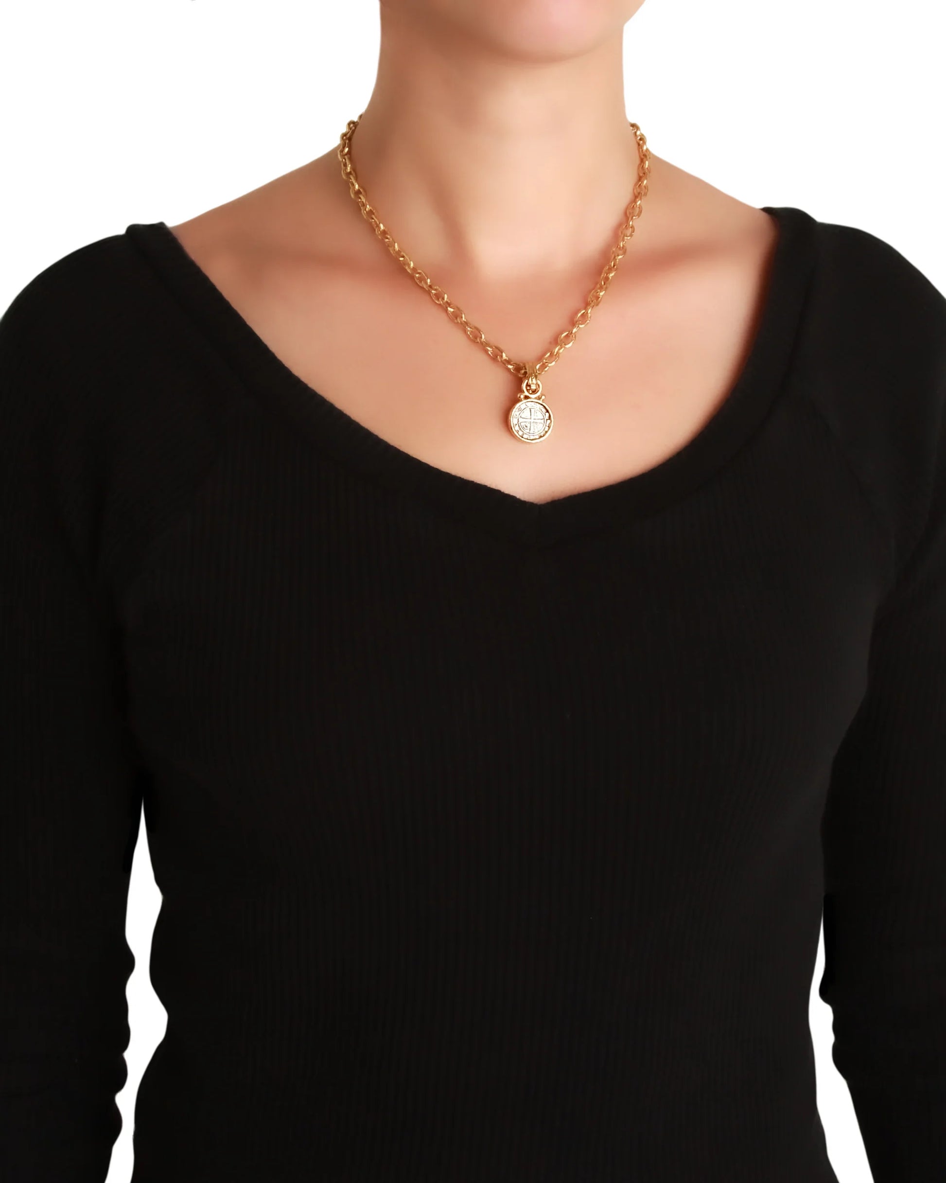 This Elizabeth Locke Ancient Silver Coin pendant is made of 19K yellow gold with a hammered finish. The Ancient 'Crusader' necklace pendant measures approximately 17mm. This listing is for the pendant only. Chain not included.