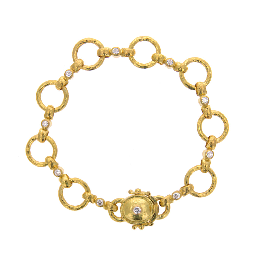 This Elizabeth Locke Celtic link chain bracelet is comprised of 19K yellow gold. The bracelet is set with 0.61 carats of diamonds. It measures approximately 7.75 inches long. It includes a box closure.