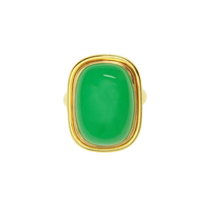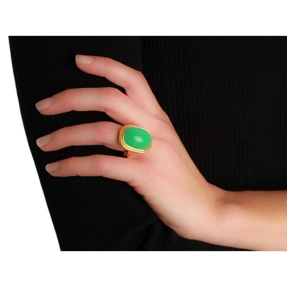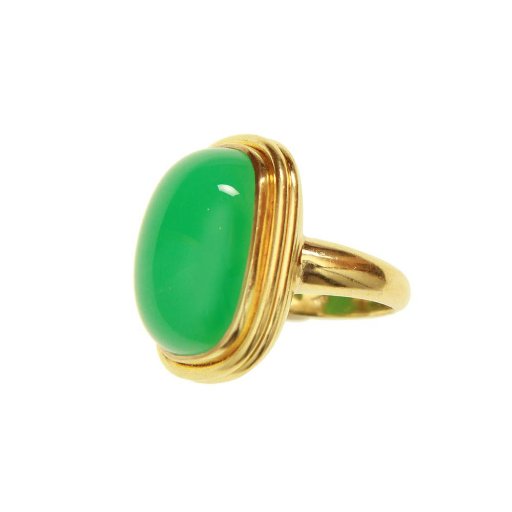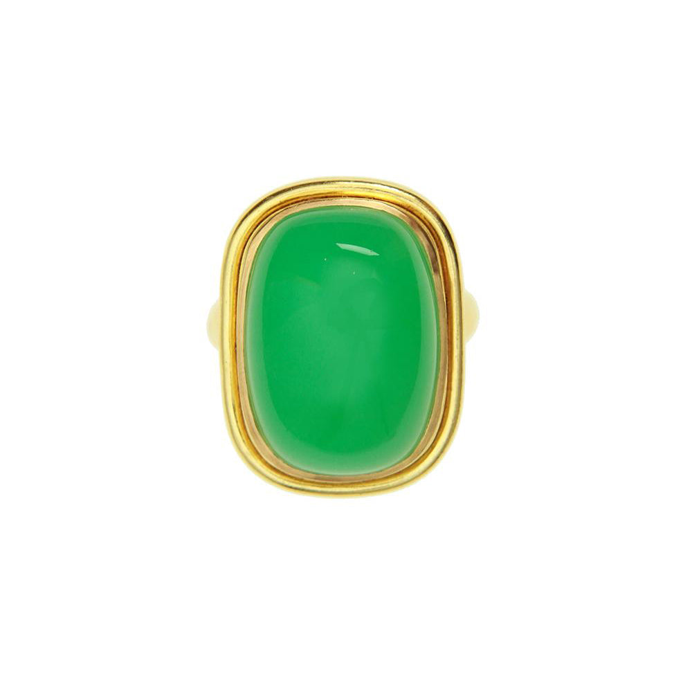 This Elizabeth Locke 19K yellow gold ring features a 16mm by 22mm chrysoprase center stone with a stacked gold ridged bezel. This ring measures approximately 26mm tall by 20mm wide.