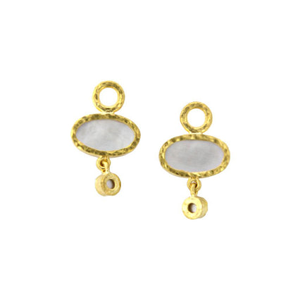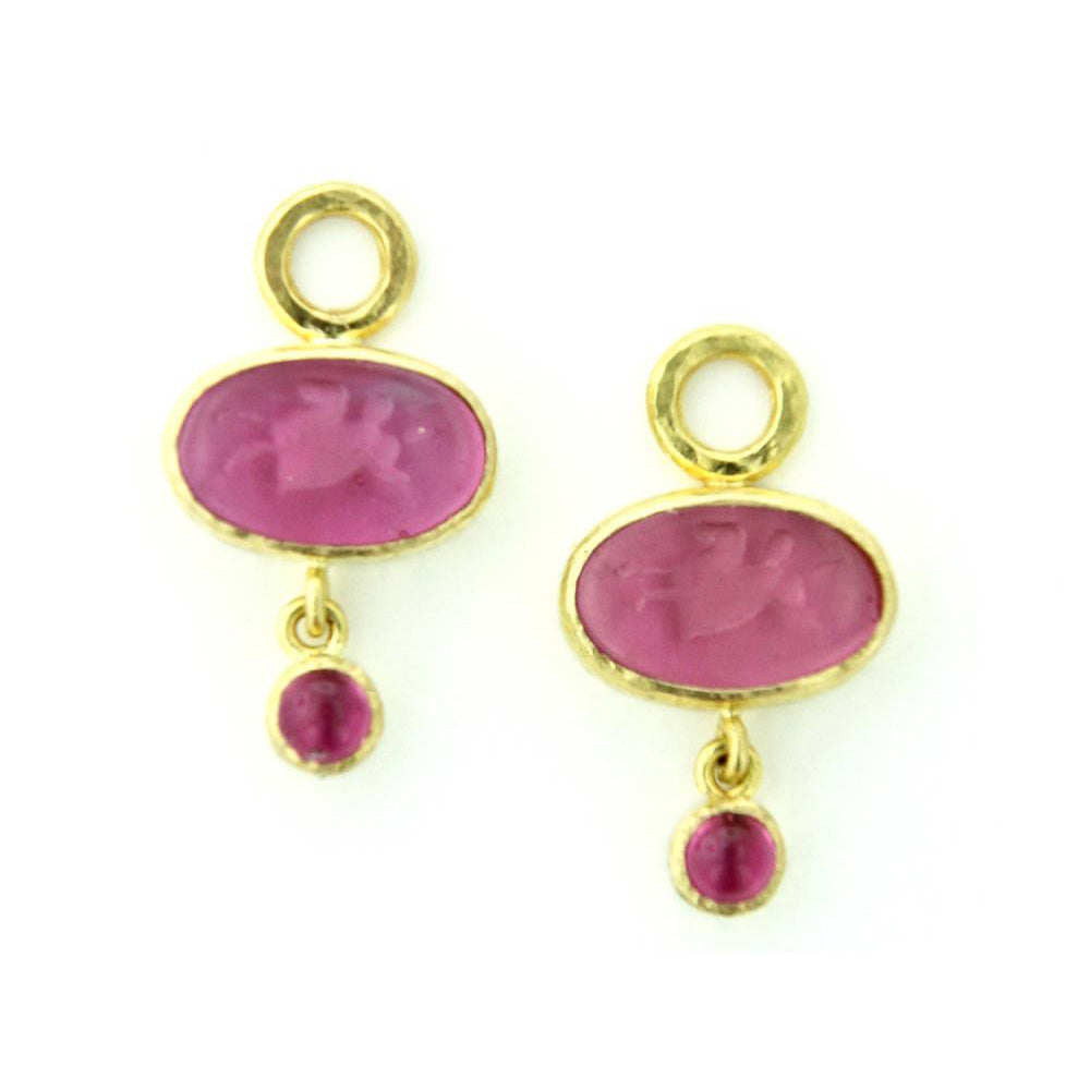 These Elizabeth Locke Venetian Glass Intaglio earring pendants are made of 19K yellow gold with a hammered finish. They the pink Venetian Glass Intaglio “Flying Pegasus” accented by pink tourmaline. The earring charms measure approximately 18mm vertically and 14mm across. They are meant to be worn on Elizabeth Locke hoop earrings and Elizabeth Locke Sarabella earrings.