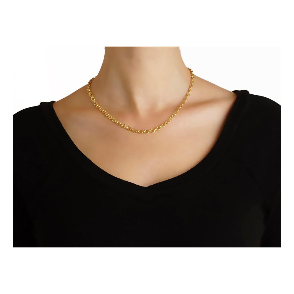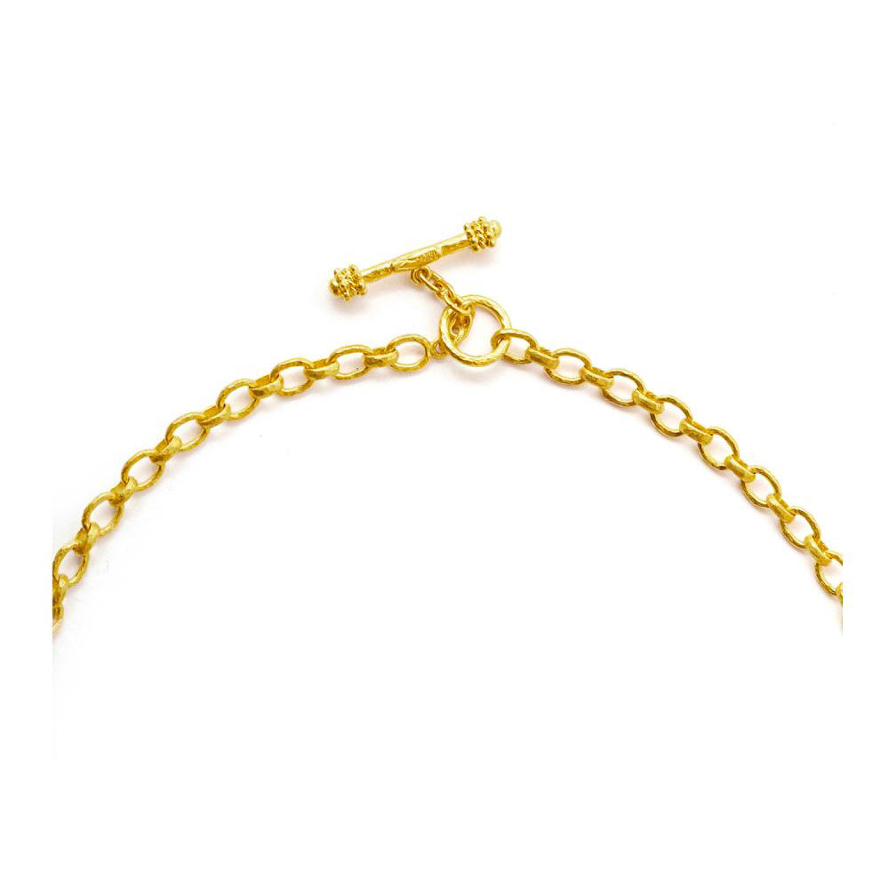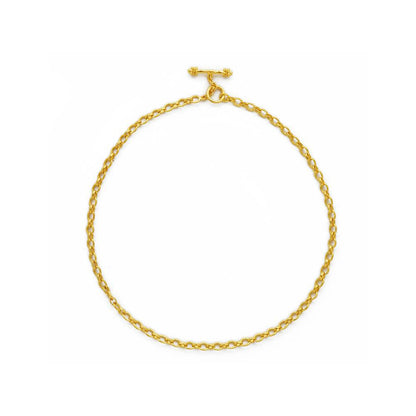 This Elizabeth Locke Gold Cortina chain necklace is made of 19K yellow gold. The small gold round link necklace measures approximately 17 inches long by 5mm wide. The necklace has a gold toggle and ring closure.