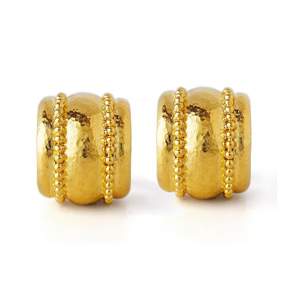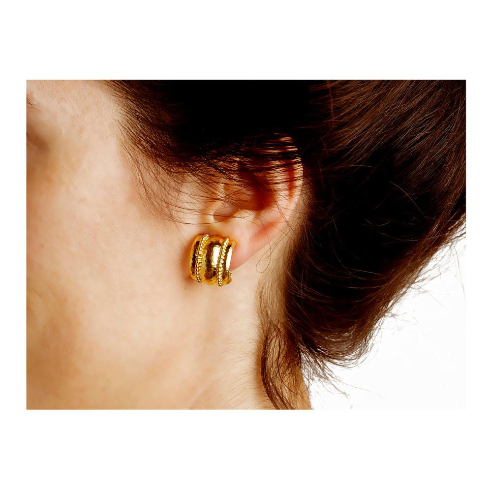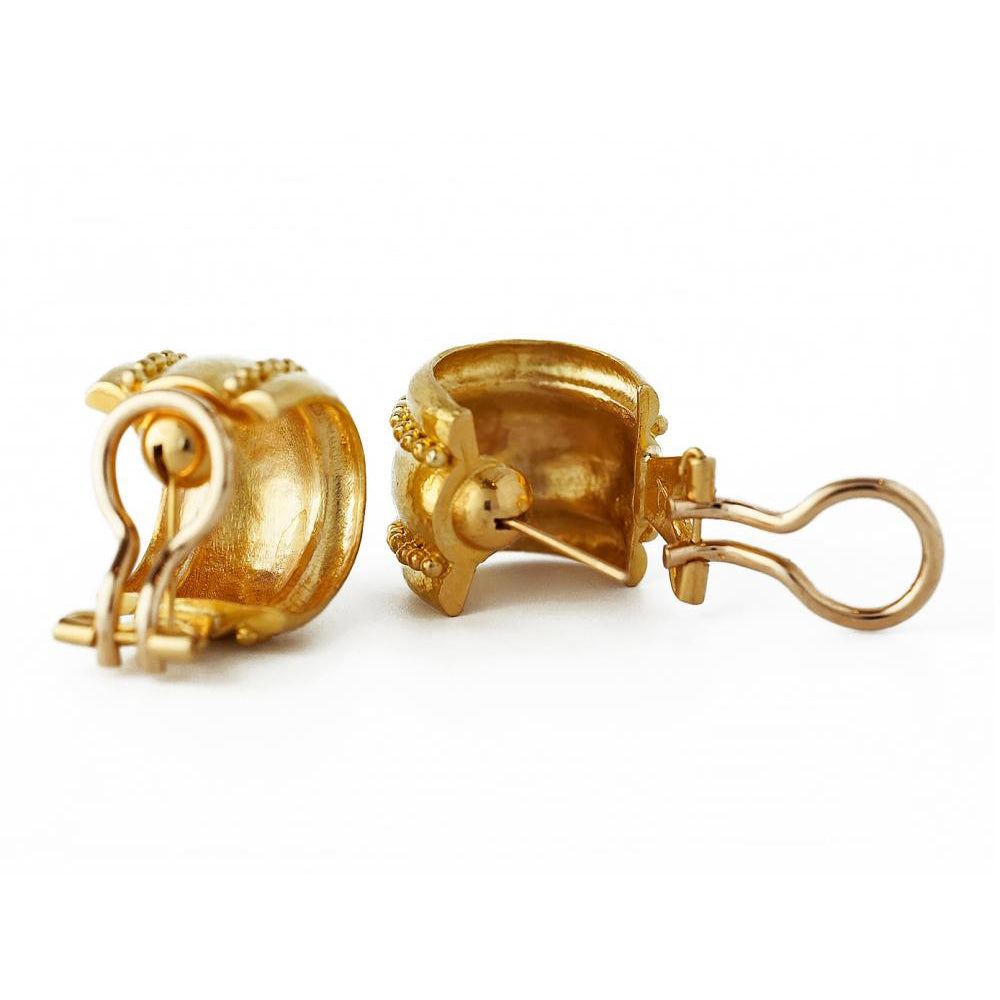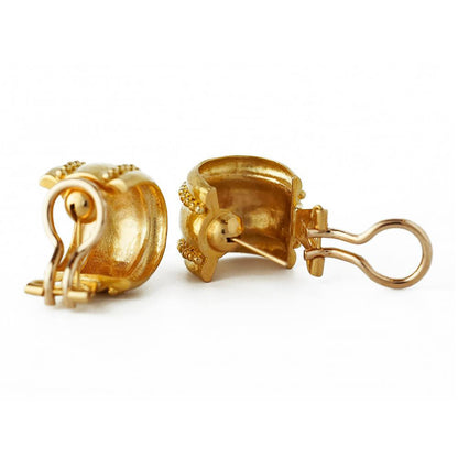 These Elizabeth Locke granulated Amalfi earrings are crafted in 19K yellow gold. These medium gold hoop earrings measure approximately 19mm long by 15mm wide. These omega back hoops feature a foldable post which allows the earrings to be worn via clip or post.