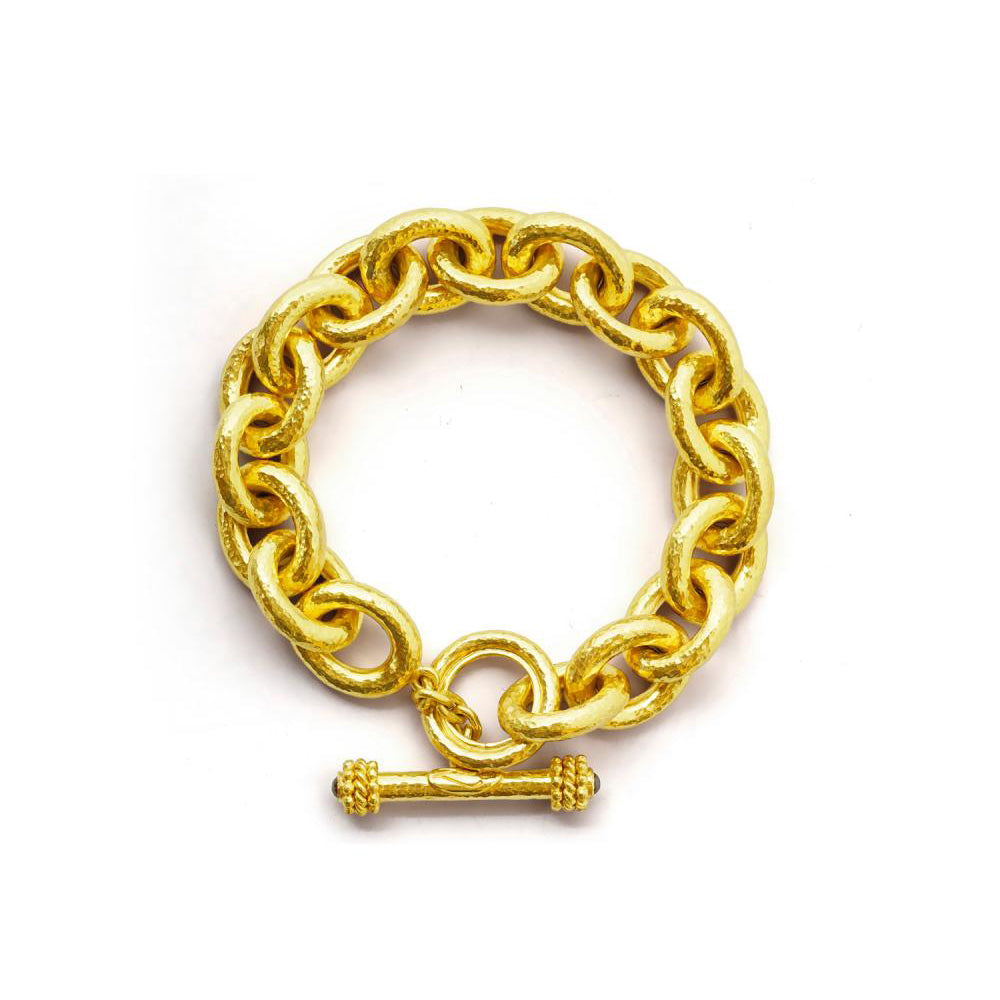 This Elizabeth Locke bracelet features 19K yellow gold oval links. The bracelet has a hammered finish and a toggle closure.