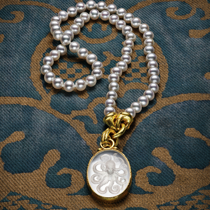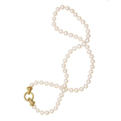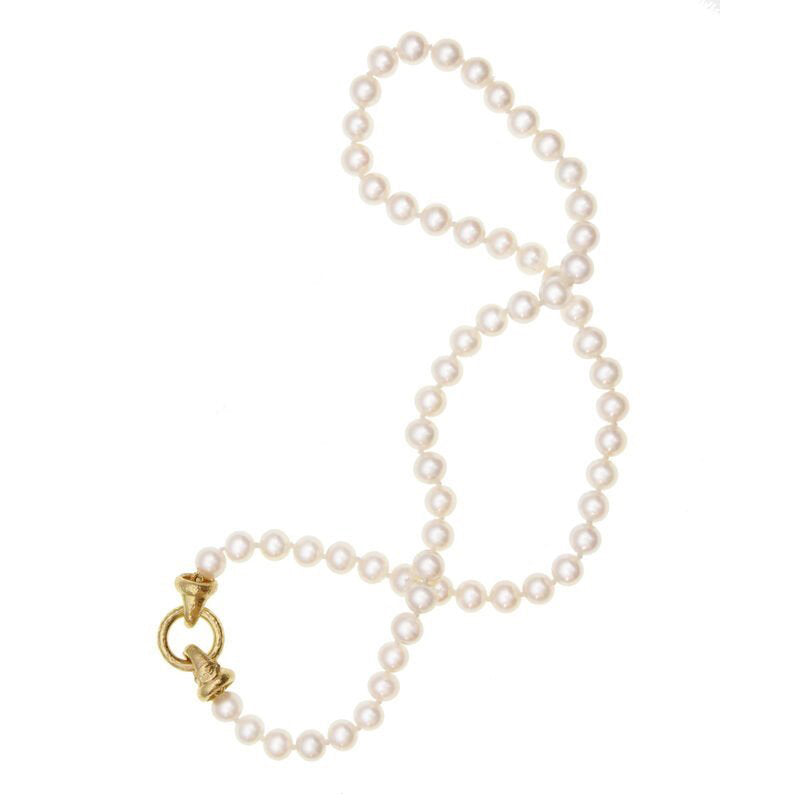 This Elizabeth Locke pearl necklace measures approximately 17 inches long and is comprised of 6-6.5mm freshwater pearls. The 19K yellow gold Serena clasp features a hidden closure and ring for pendants.