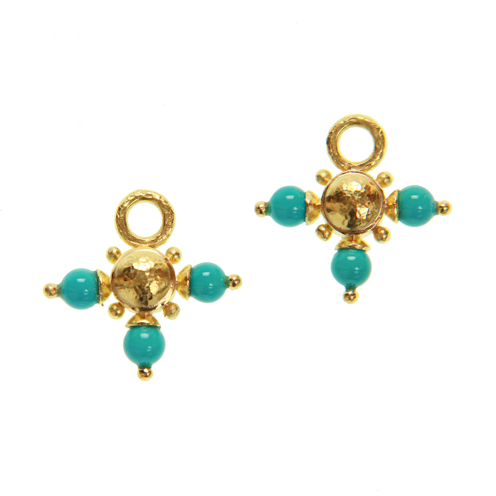 These Elizabeth Locke earring pendants are made of 19K yellow gold. The earring charms showcase Sleeping Beauty turquoise spokes. These small earring pendants measure approximately 15 mm vertically by 21 mm across. They are meant to be worn on Elizabeth Locke hoops or 'Sarabella' earrings.