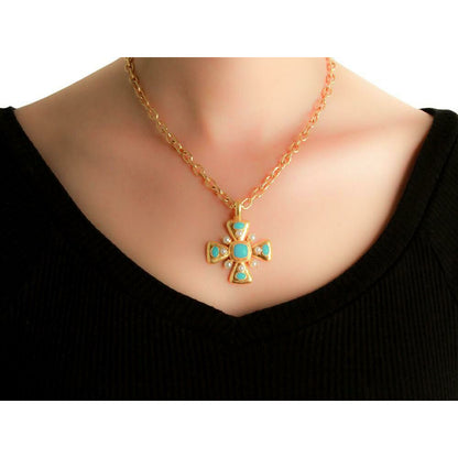 This Elizabeth Locke cross pendant is fashioned in 19K yellow gold. The Maltese cross pendant is set with 1.52 carats of Sleeping Beauty turquoise gemstones and features pearl spokes. It measures approximately 38 x 38mm and has a hinged bale.