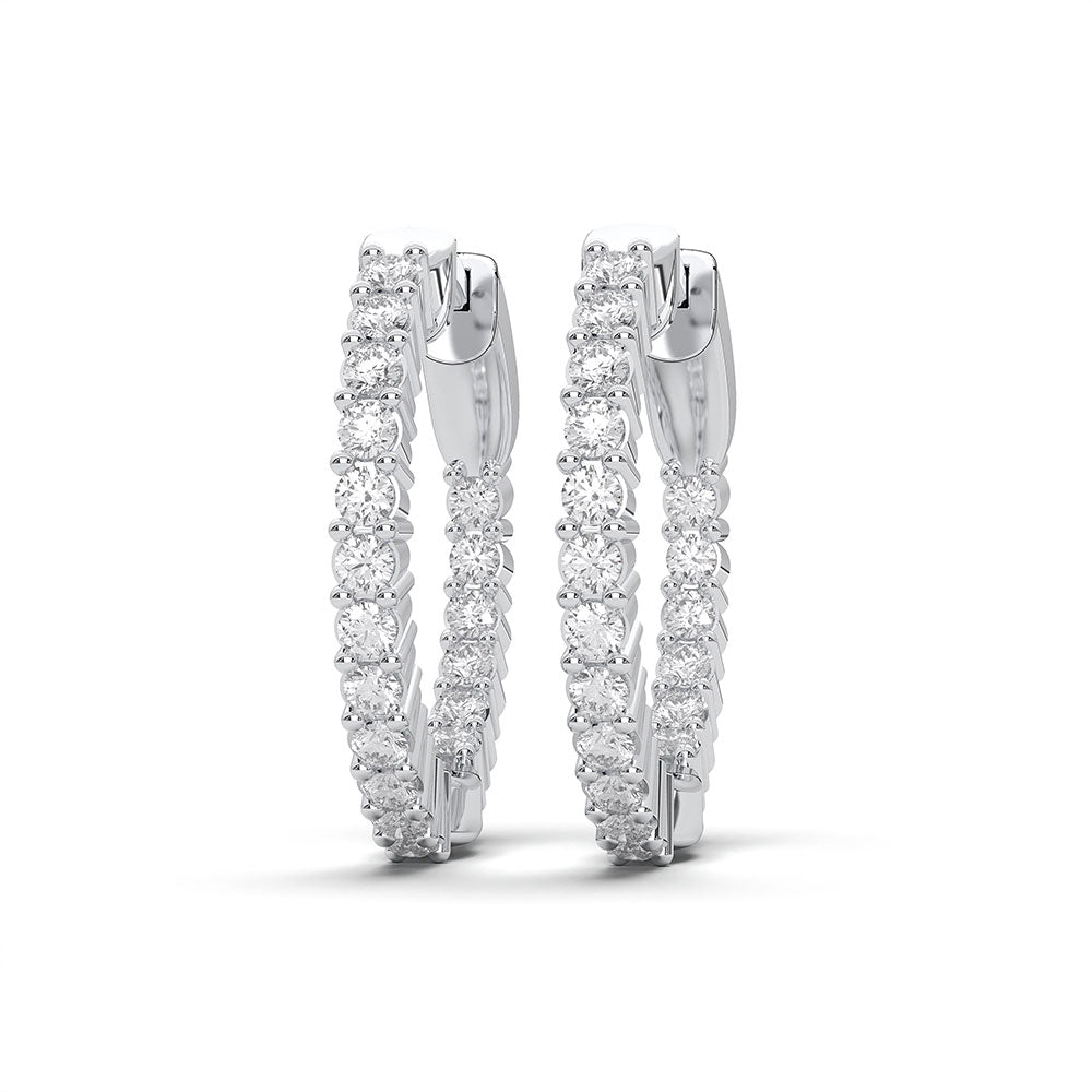 These lab grown diamond hoops are made of 14K white gold. The hoop earrings are set with 1.99 carats of F-G color, VS clarity lab created diamonds.