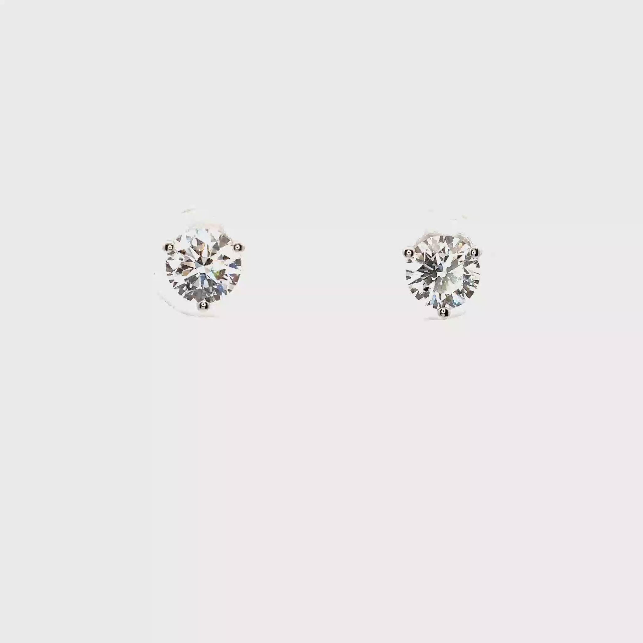 These lab grown diamond stud earrings are set in 14K white gold. The studs feature DEF color, VS clarity round lab created diamonds in three-prong martini settings. The synthetic diamond studs have a total diamond weight of 1.09 carats.