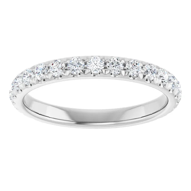 This Ella Rose lab grown diamond wedding band is comprised of 14K white gold. The ring is set with 0.62 carats of D-E-F color, VS clarity lab created diamonds set part way around the band.