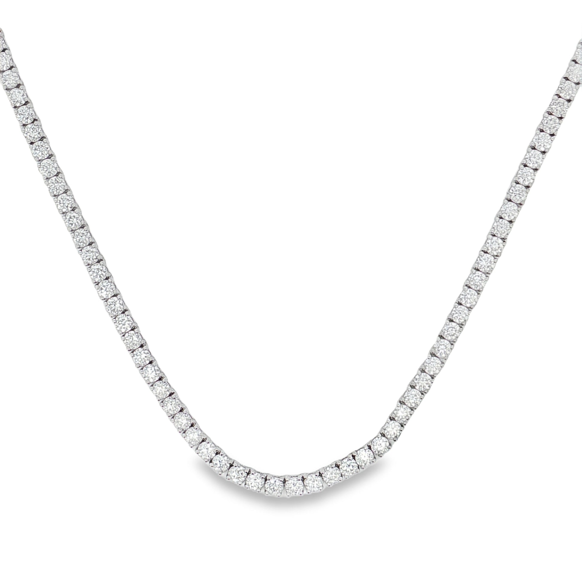 Crafted in 14K White Gold, this exquisite necklace showcases 17.64 carats of lab-grown diamonds graded DEF/VS — ethically grown and visually identical to mined diamonds. A masterpiece of fine craftsmanship, each stone has been meticulously set to adorn with exceptional radiance. Wear it close to the heart as a celebration of beauty, brilliance, and enduring style.