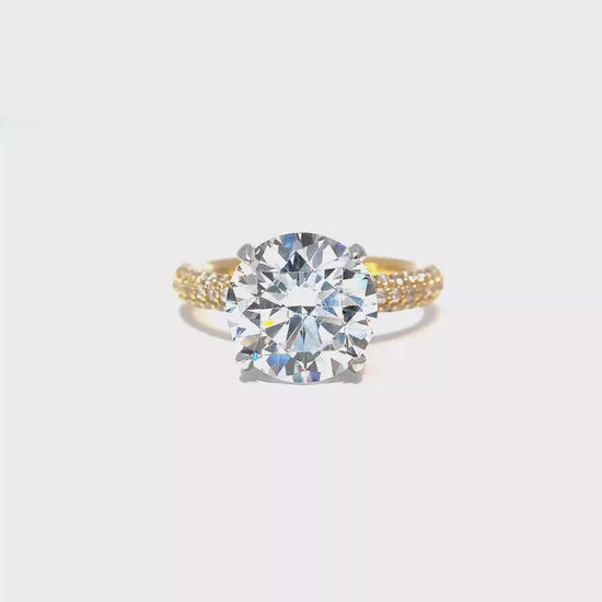 This exquisite Ella Rose engagement ring mounting is meant to hold a round center stone in an 18K white gold setting. The shank of the ring is crafted in luxurious 18K yellow gold and set with multiple rows of pave diamonds totaling 0.74 carats, making it a perfect symbol of enduring love and commitment. This listing is for an engagement ring setting only. Center diamond sold separately.