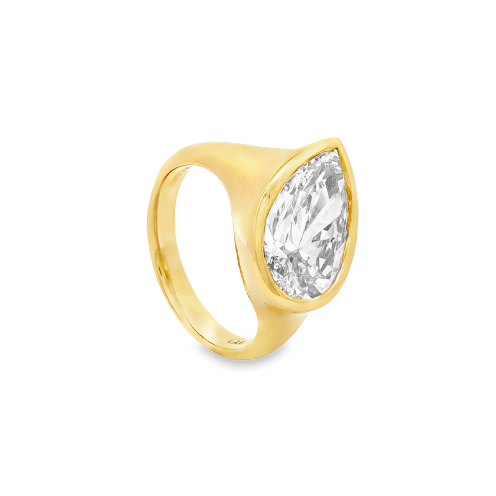 Set in polished 14K yellow gold, this refined ring highlights a striking 4.01 carat pear-shaped lab-grown diamond. The bezel-inspired frame follows the stone’s tapered silhouette, creating a smooth, sculptural outline that enhances its elongated form.