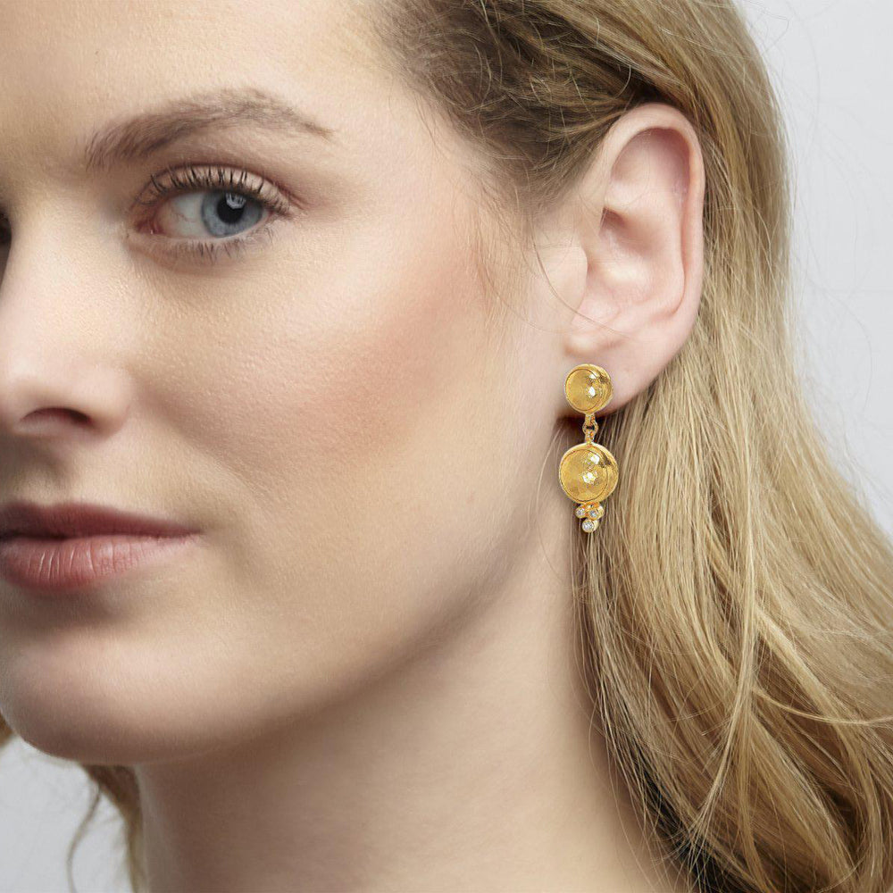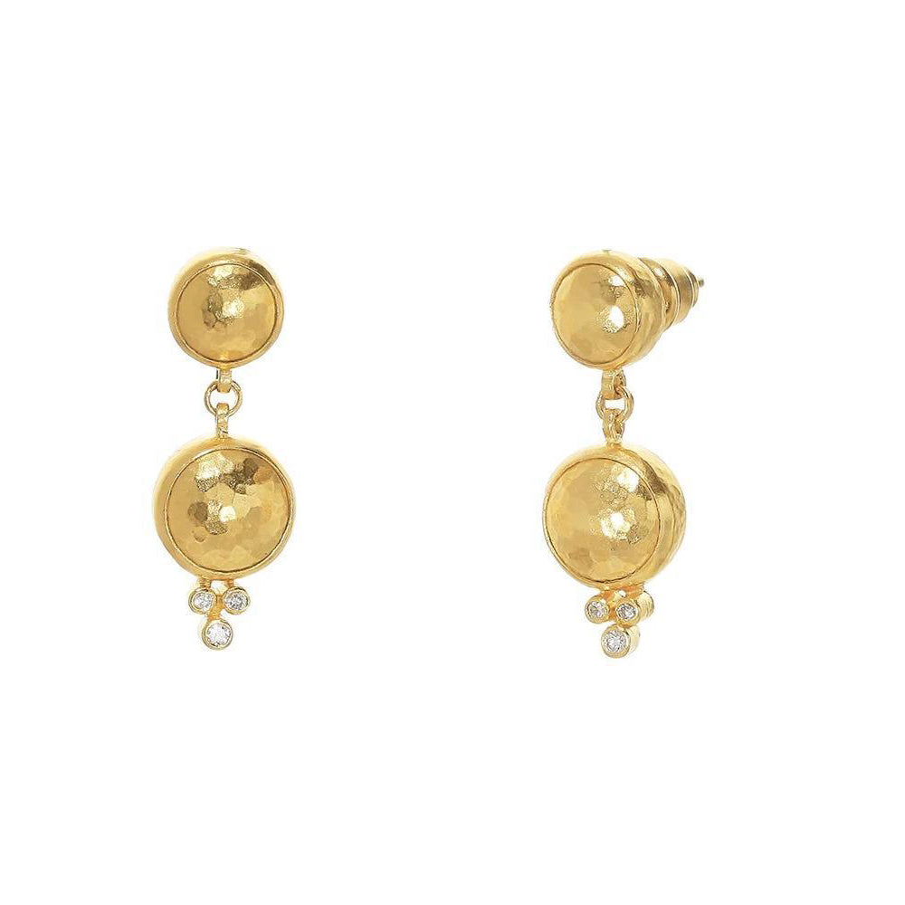 These Gurhan Amulet Double Drop Earrings are crafted in 24K yellow gold. Each earring is approximately 1.20 inches long and is set with three round diamonds. The earrings have a total diamond weight of 0.12 carats.