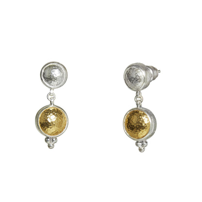 These Gurhan Amulet Small Double Drop Earrings are made of sterling silver and 24K yellow gold vermeil. These dangle earrings are approximately 1.15 inches long and 11mm wide.