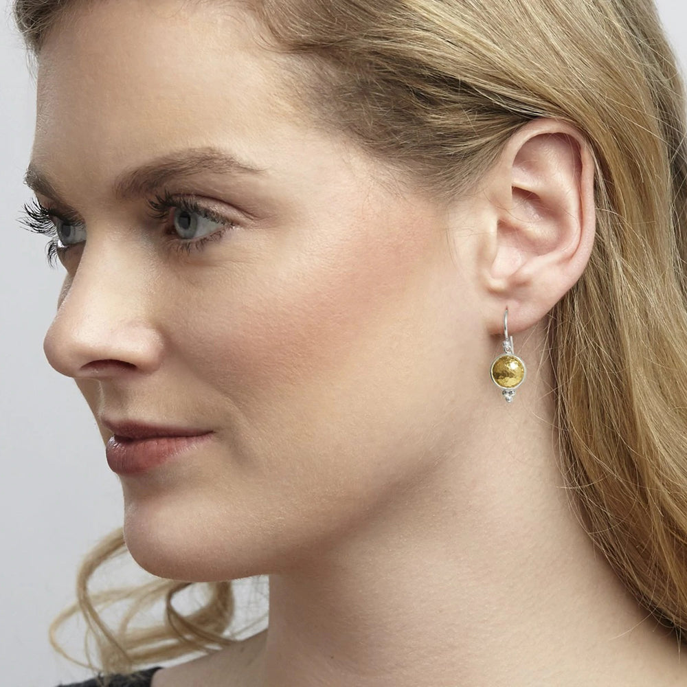 These Gurhan Amulet wire drop earrings are crafted of sterling silver with 24K yellow gold plating. The earrings are approximately 1.05 inches long and 11 millimeters wide.