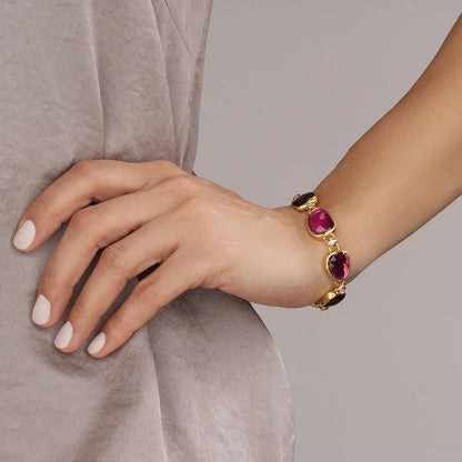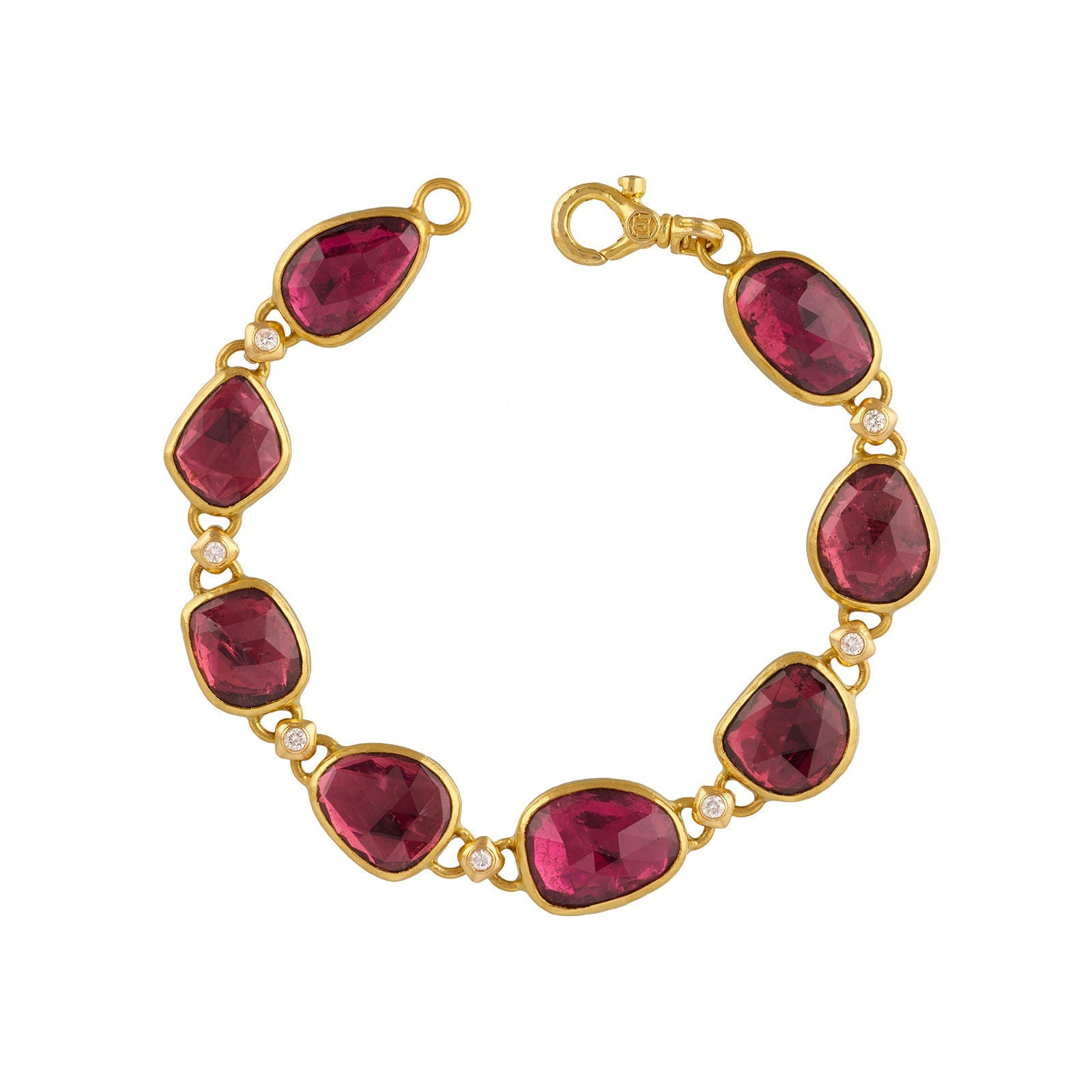 This Gurhan Elements bracelet is comprised of 24K yellow gold. The bracelet is set with 39 carats of pink tourmaline gemstones accented by 0.38 carats of diamonds.