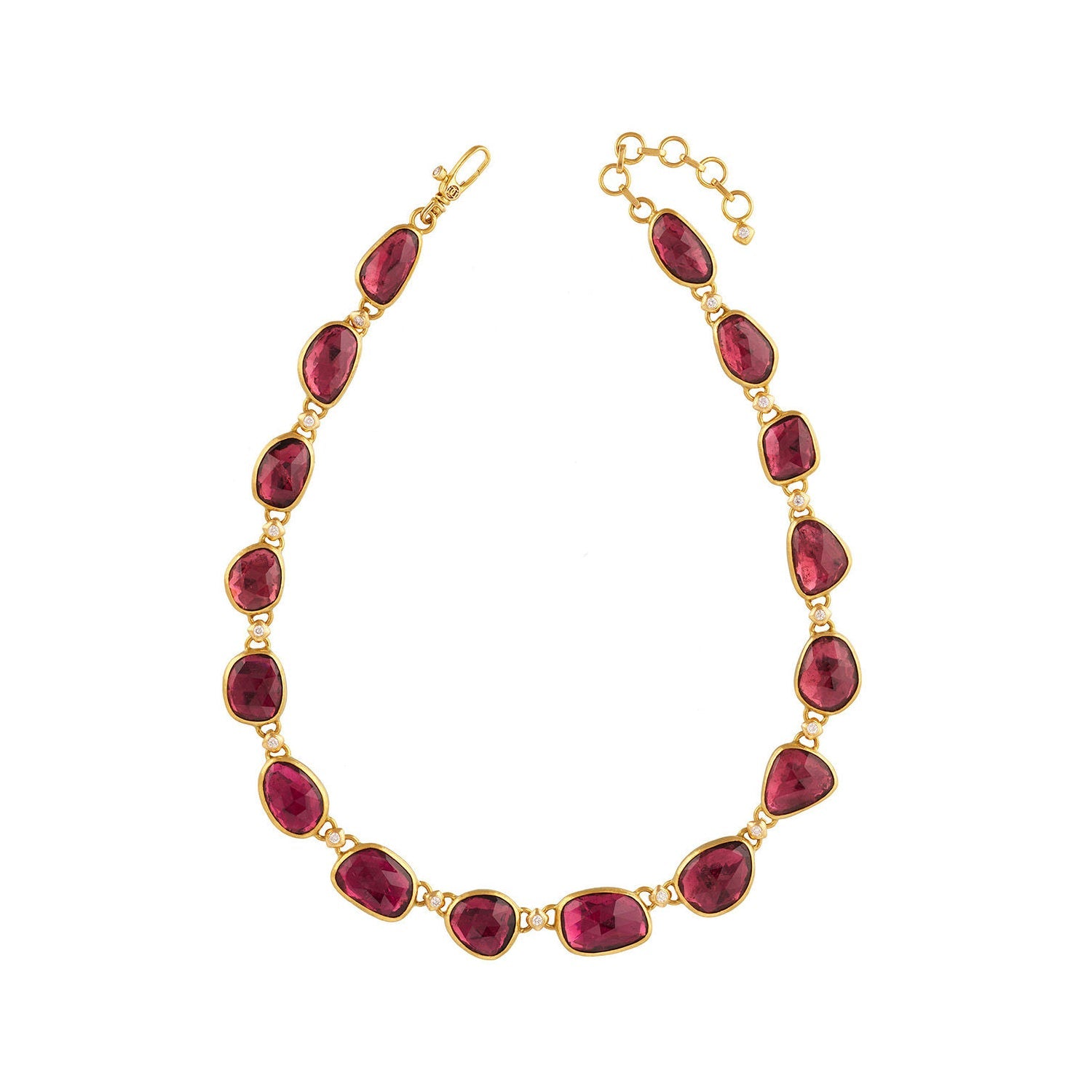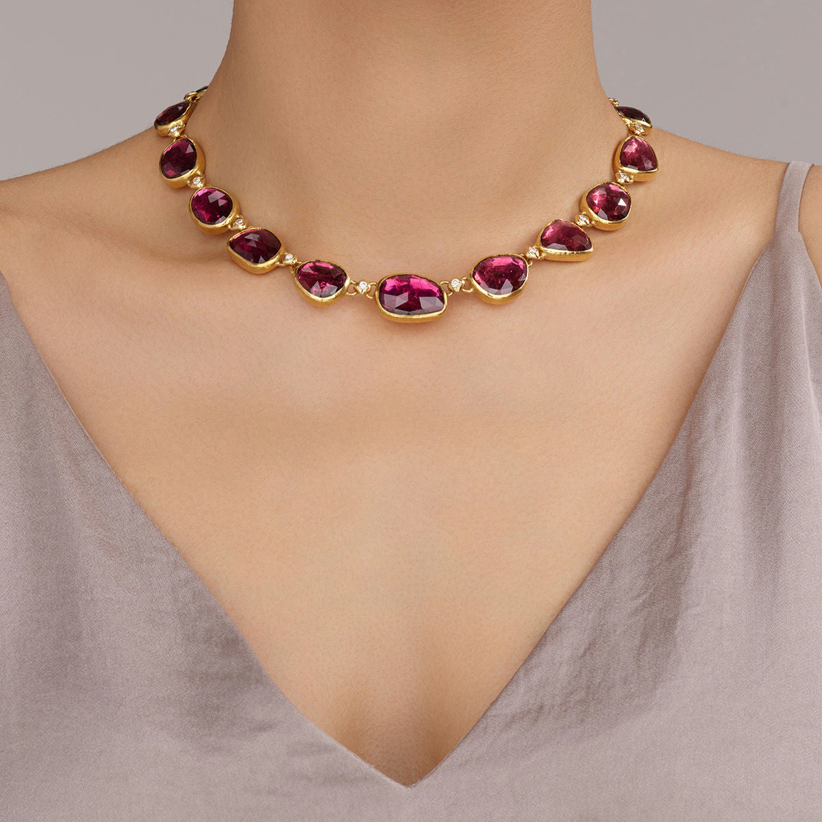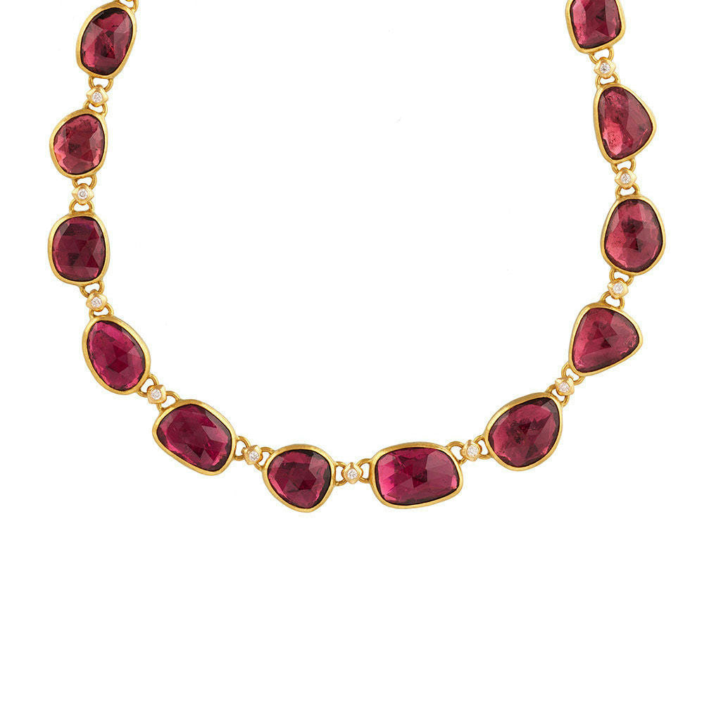 This Gurhan Elements pink tourmaline necklace is crafted in 24K yellow gold. The necklace showcases 97.36 carats of pink tourmaline gemstones accented by 0.88 carats of diamonds.