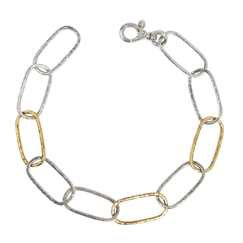 This Gurhan Geo Elongated Link Bracelet is crafted of open, interlocking elongated sterling silver and 24K yellow gold vermeil links. The bracelet is approximately 8 inches long and has a lobster claw closure.