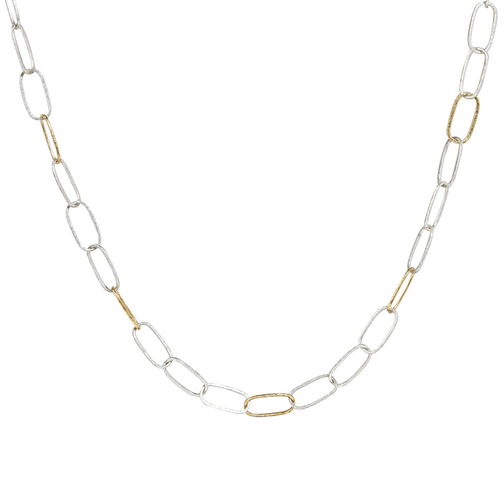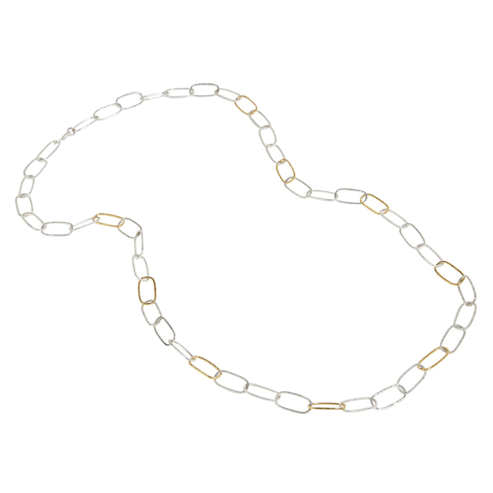This Gurhan Geo Elongated Link Necklace is crafted of open, interlocking elongated sterling silver and 24K yellow gold vermeil links. The necklace is approximately 36 inches long with a lobster claw closure.