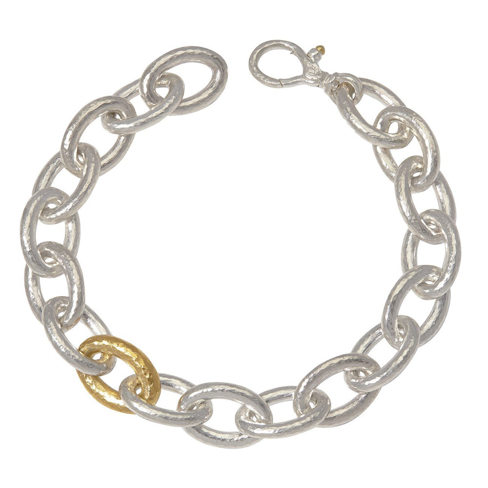 This Gurhan Hoopla Medium Oval Link Bracelet is crafted of open, interlocking oval sterling silver and 24K yellow gold links. The bracelet has a lobster claw closure and is approximately 8 inches long.