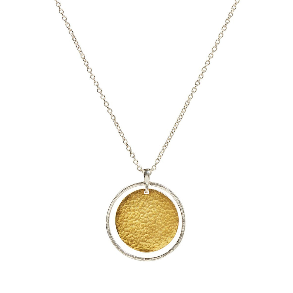 This Gurhan Lush Large Round Necklace features a circular pendant crafted in sterling silver and 24K yellow gold. The pendant measures 30mm by 25mm. The chain is adjustable 16 inches to 18 inches long and has a lobster claw closure.