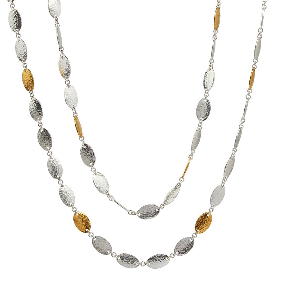 This Gurhan Mango Single Strand Long Necklace is approximately 36 inches long and features a lobster claw clasp. It features a single strand of small oval hammered sterling silver and 24K yellow gold vermeil discs.