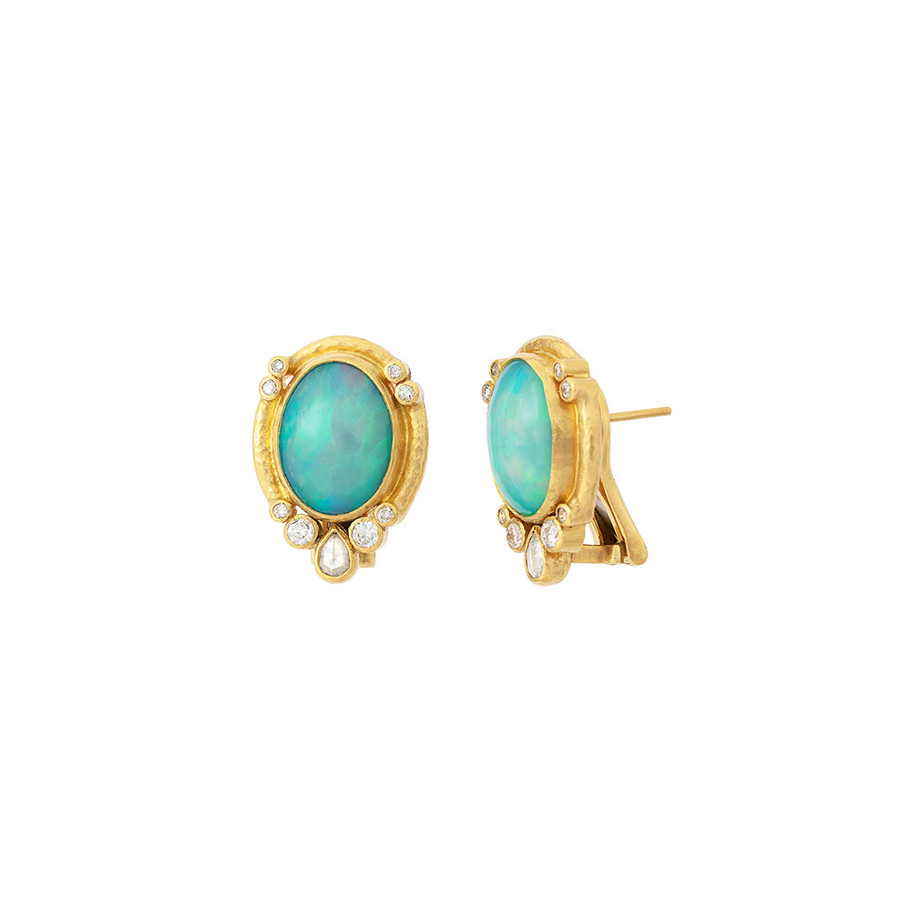 These Gurhan Muse stud earrings are fashioned in 24K yellow gold. The studs showcase oval Ethiopian opal center stones accented by diamonds. The total opal weight is 8.07 carats and the total diamond weight is 0.72 carats.