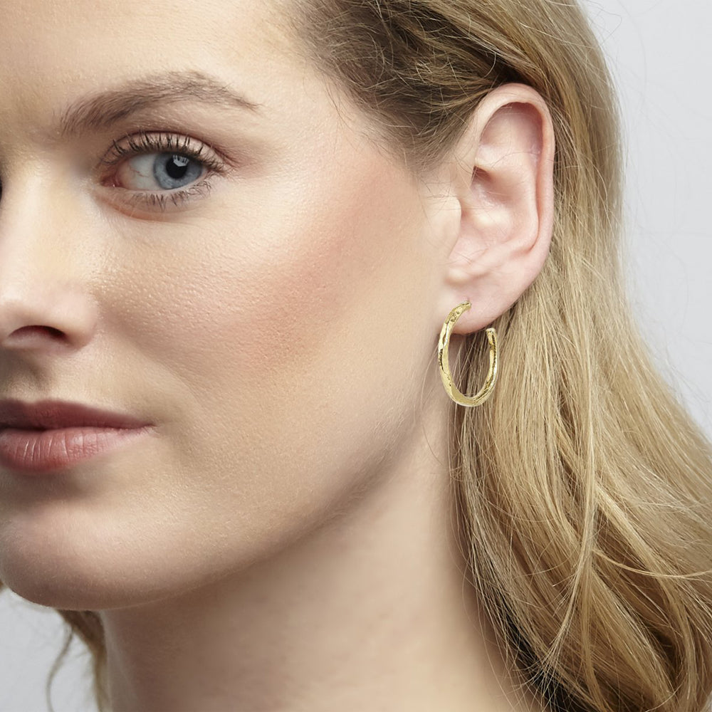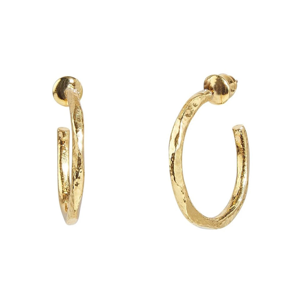 These Gurhan Thor Medium Hoop Earrings are crafted in 24K yellow gold. These hammered gold hoop earrings are approximately 1 inch long.