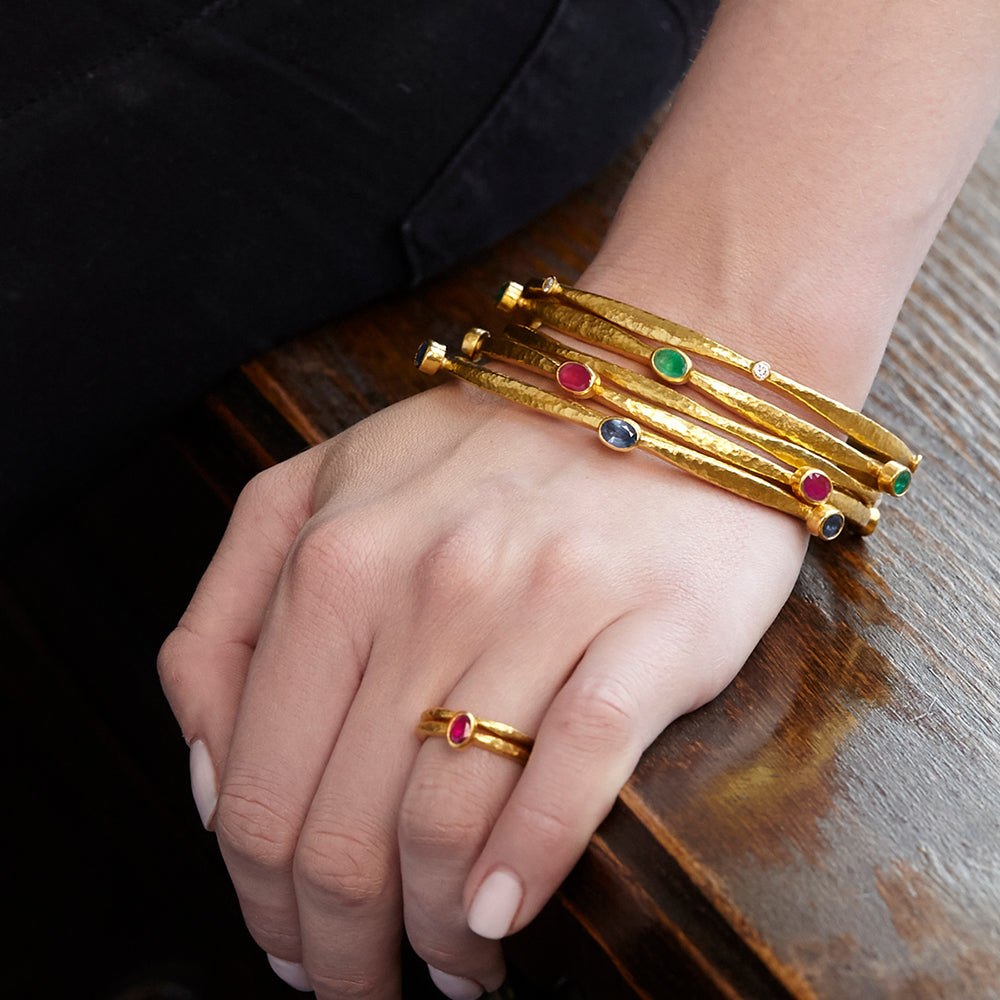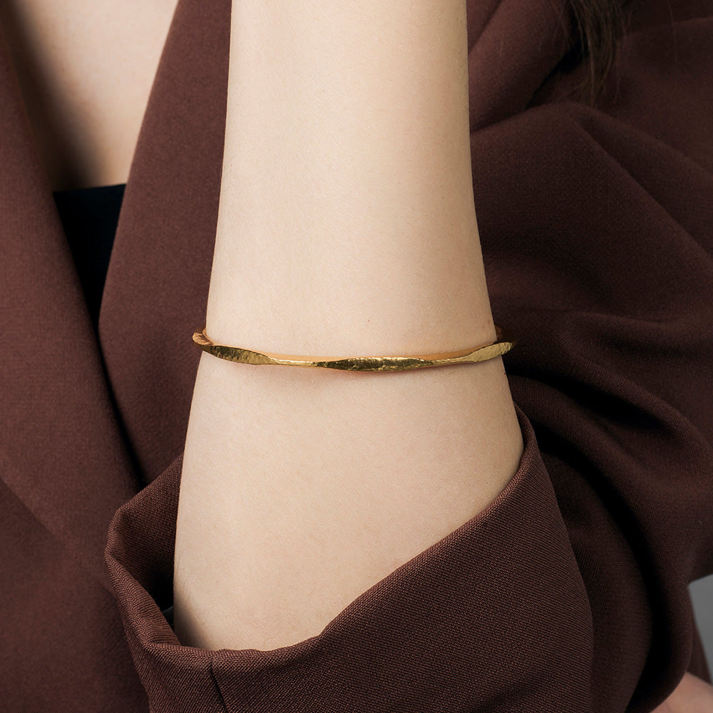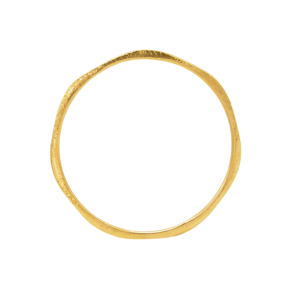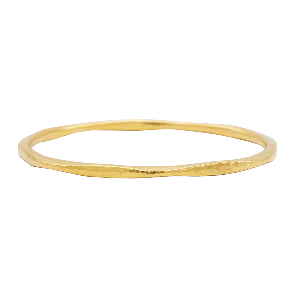 This Gurhan Thor bangle bracelet is made of hammered 24K yellow gold. This plain gold bangle measures approximately 65mm in diameter and is 0.15 inches thick.